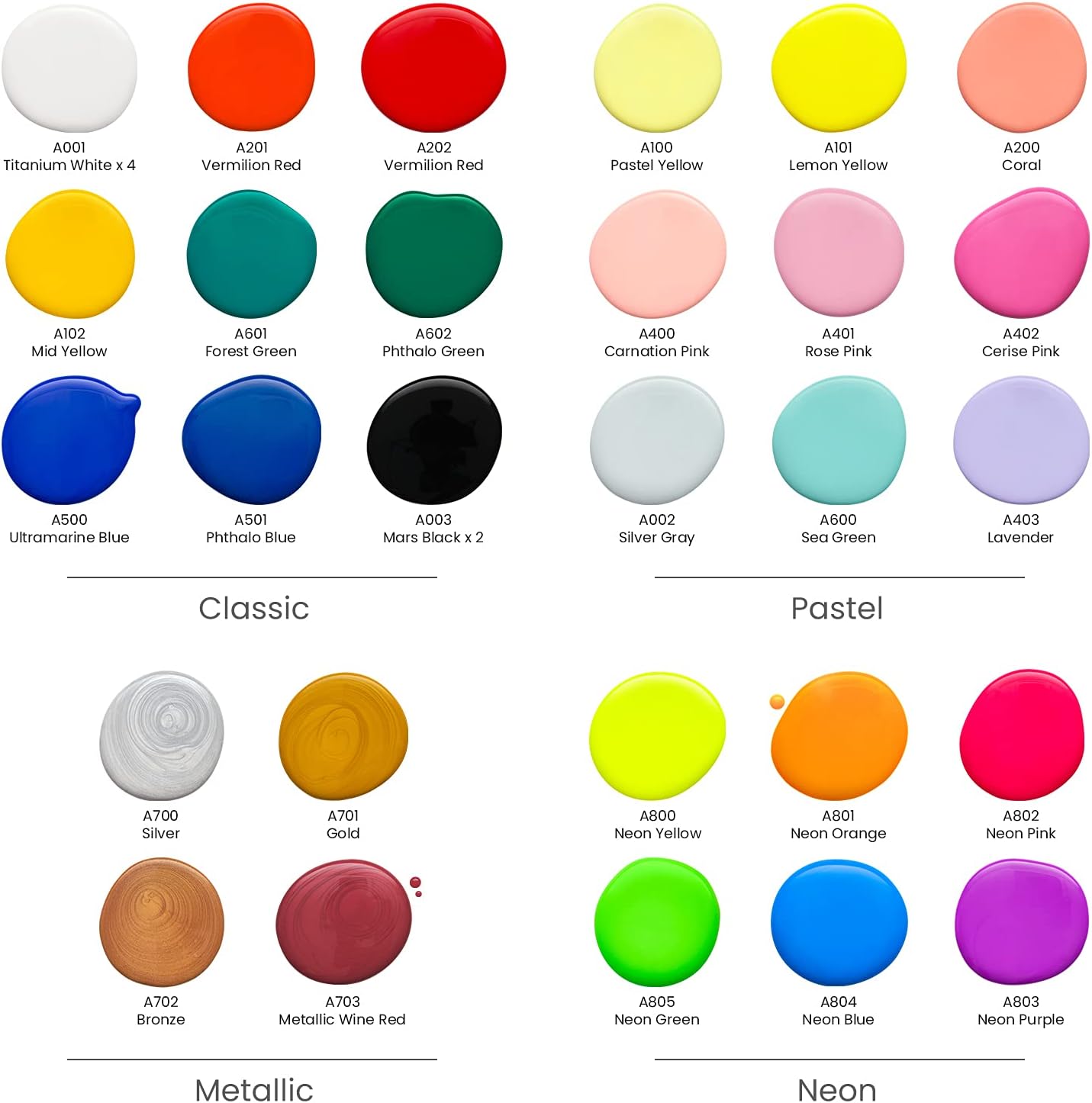 - Pouring Acrylic Paint in 32 Colors - This impressive set includes 32 vibrant colors from metallics to neons to pastels and primaries. You’re never at a loss for color when you’re creating original fluid art.