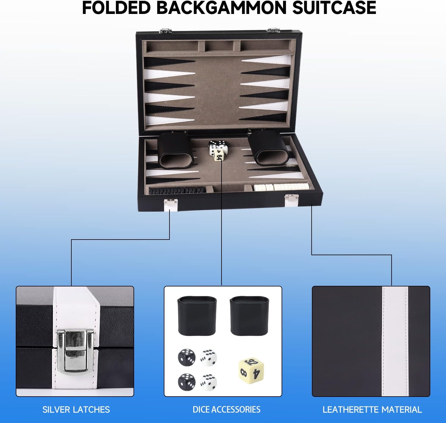- Premium Material: The leather backgammon game set is made from black leatherette material with two white stripes on the outside, the interior is made of soft felt interior with leatherette points; the black and white triangular points are made of the same leatherette material as the outside, and they are stitched to the playing surface