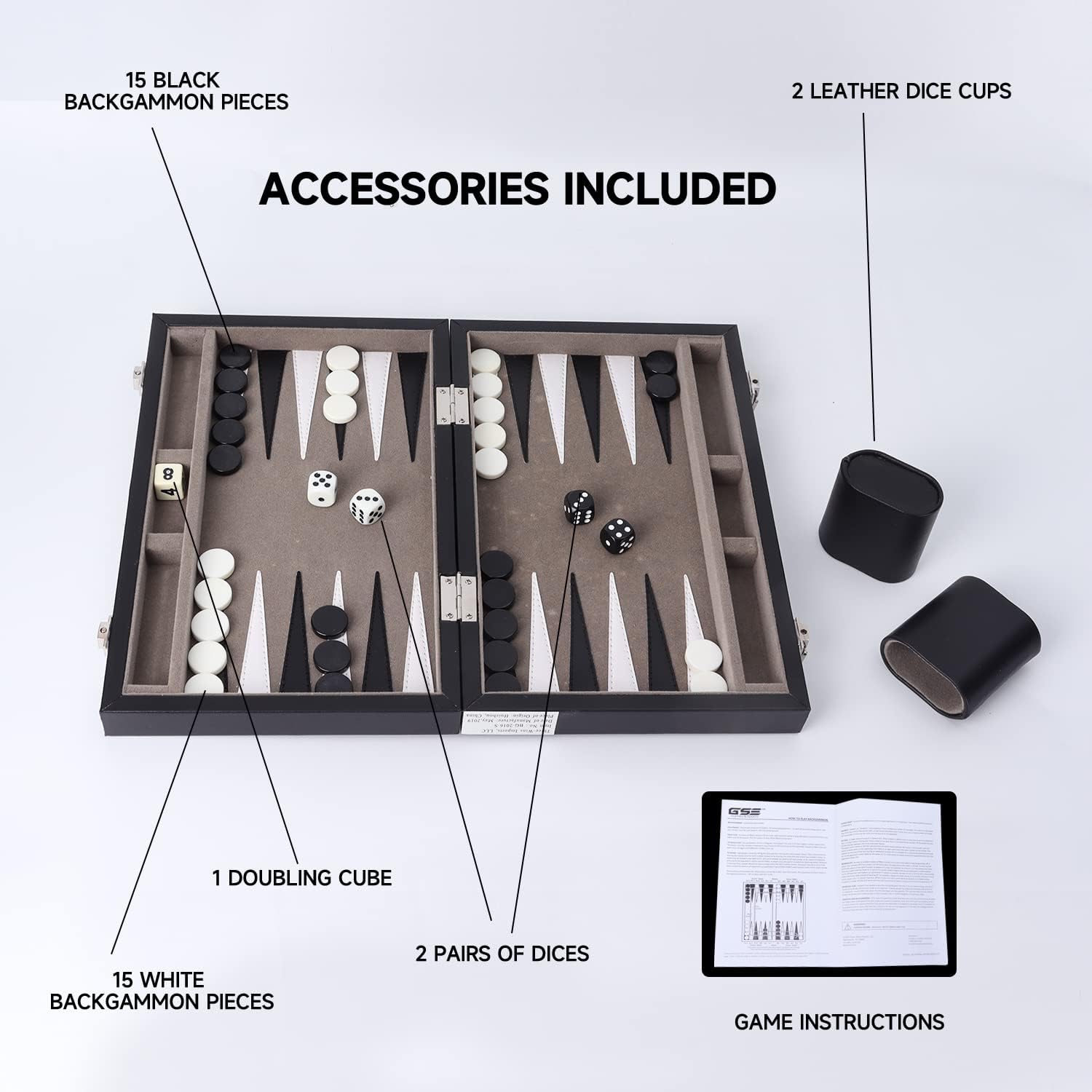- Complete Set: The backgammon board game set includes 15 white backgammon pieces, 15 black backgammon pieces as well as an accompanying pairs of dice for each color, a doubling cube, two leather dice cups, and game instructions