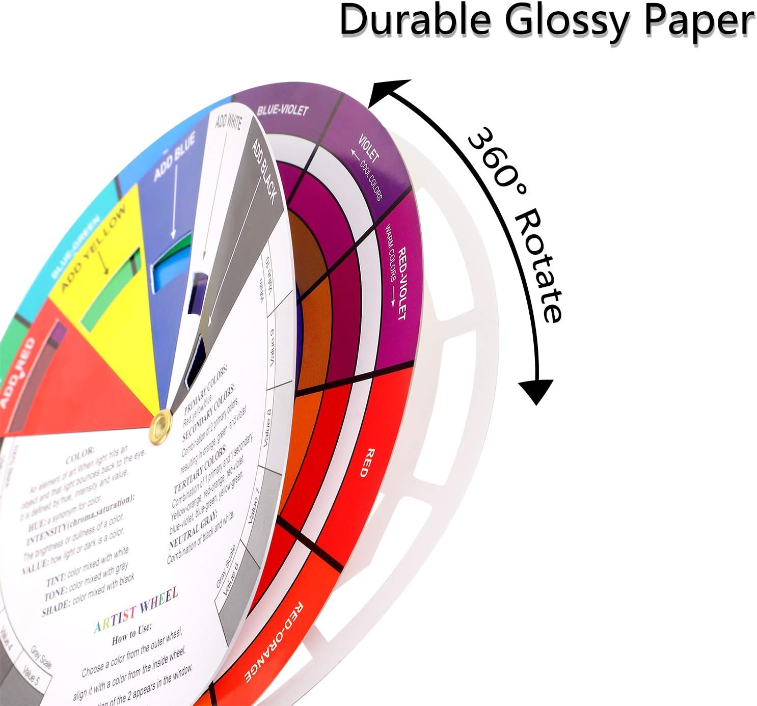 - Package include: 2 creative color wheel, 5.5 inch in diameter, the artist wheel helps show which colors are complimentary, and how they go (or don't go) together, suitable for learning how to color; Two identical color wheels, with different designs on the front and back