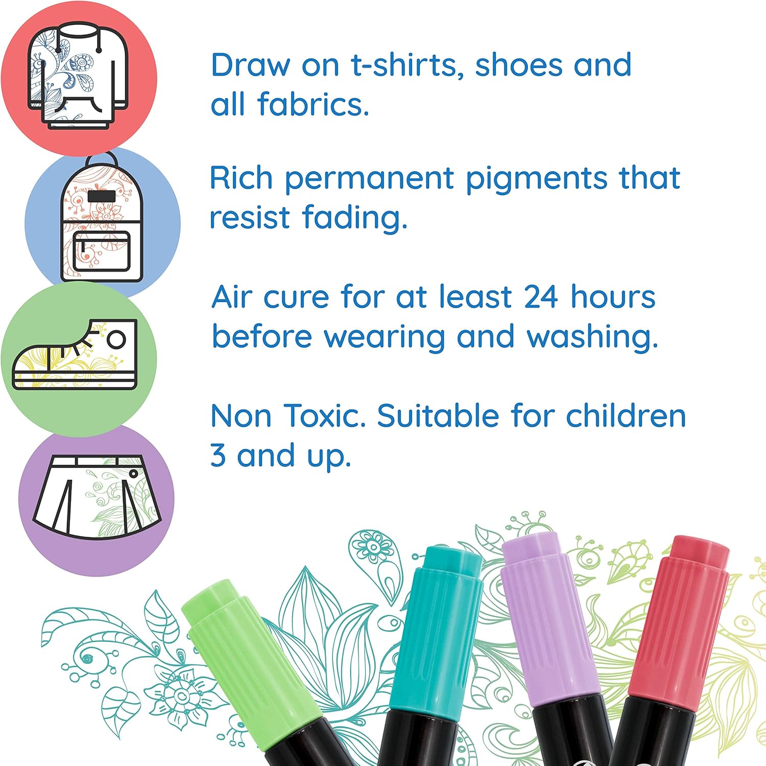 - Fun, Safe and Easy to Use: They are non-toxic, fade proof, washerproof and conform to ASTM D4236 and EN71 certifications for art products. They are suitable for all ages and have breathable caps. Everyone loves our Crazy Colors fabric markers, because of their ease of use and the exceptional vibrant visual results they achieve with them.
