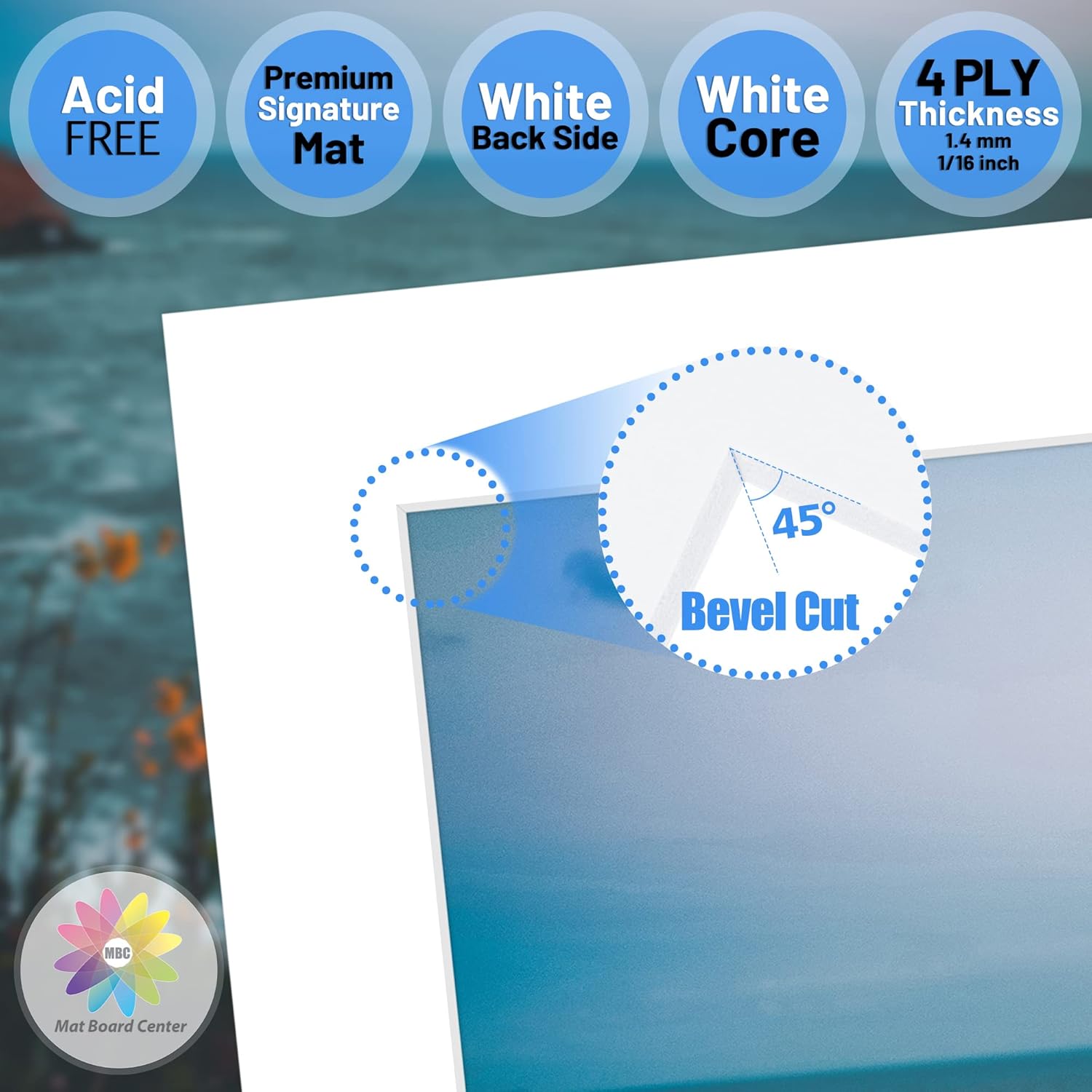 - White Core, 4-ply (1/16in - 1.4mm), Bevel Cut, Acid Free Mats