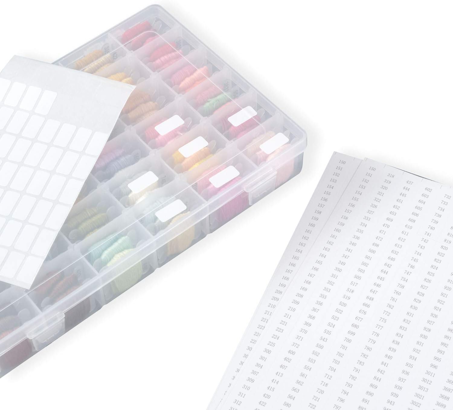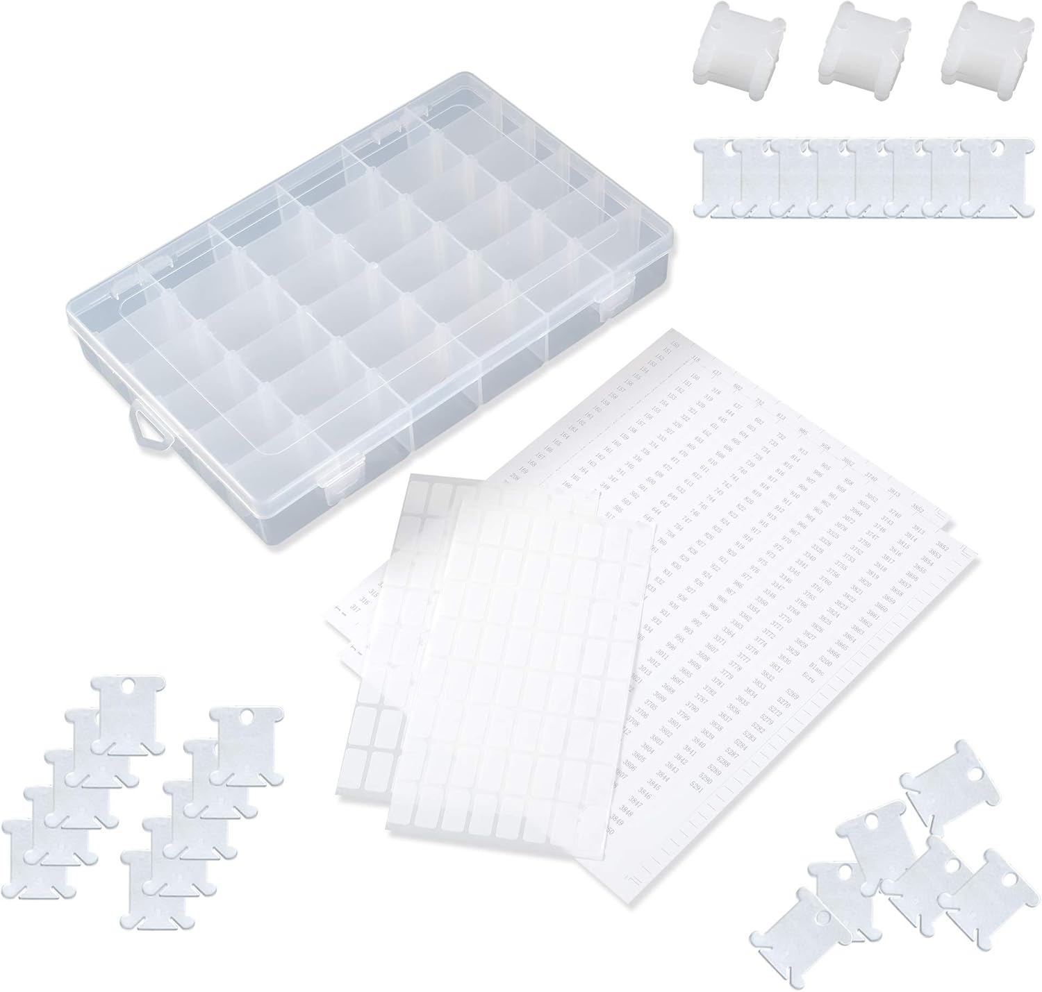 - Contain 1 Pack of 36 Compartments plastic organizer box, 120 plastic floss bobbins, 2 pieces of Color Cards and 2 pieces of big marker stickers ( each contain 64 pieces small sickers ) .