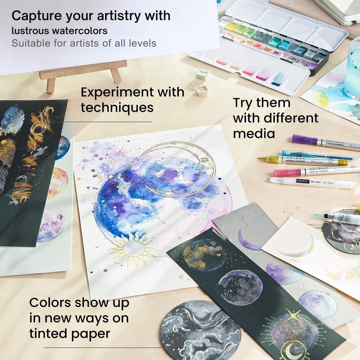 ARTEZA Watercolor Paint Set, 24 Metallic Watercolor Paints, Glitter Watercolor Paint in Half Pans, Travel Watercolor Set