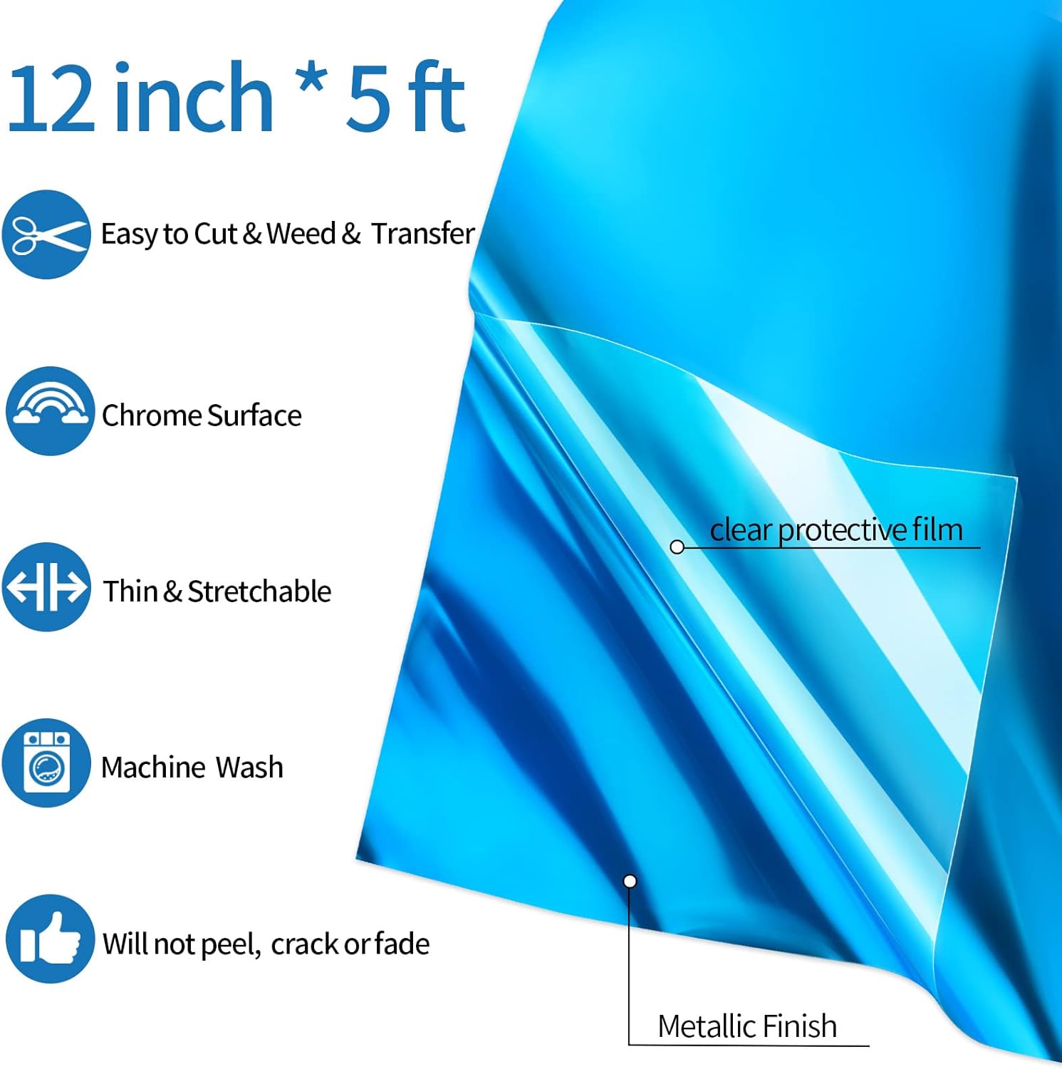 VINYL FROG Metallic Foil HTV Vinyl Roll 12" x5ft Blue Heat Transfer Vinyl Chrome Iron on Vinyl Easy to Cut & Weed DIY Heat Press Design for T-Shirts