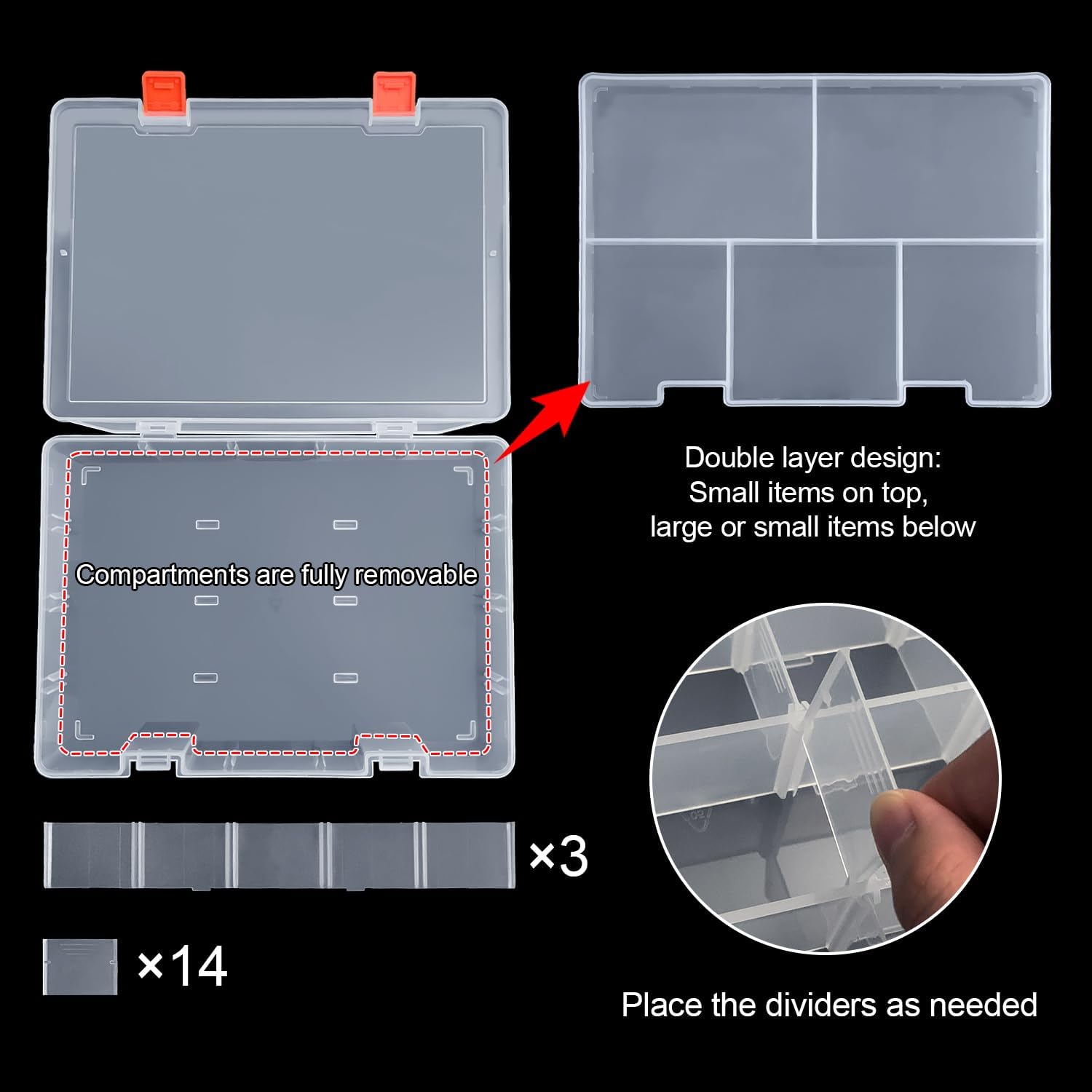 - Dimensions: Box dimensions are 9.65" x 6.89" x 1.65". The top tray has 5 fixed compartments, while the lower layer adjusts from 1 to 18 compartments. This makes it a versatile parts storage solution, whether as a bead organizers and storage or a craft storage containers.