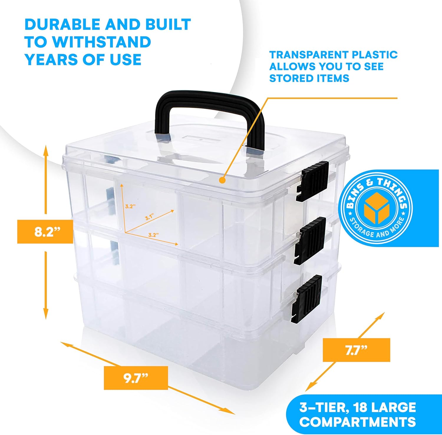 Bins & Things Clear 3-Tier Stackable Storage Containers with Lids - 18 Adjustable Compartments for Bead - Organizing Drawers for Jewelry, Kids Toys, Makeup