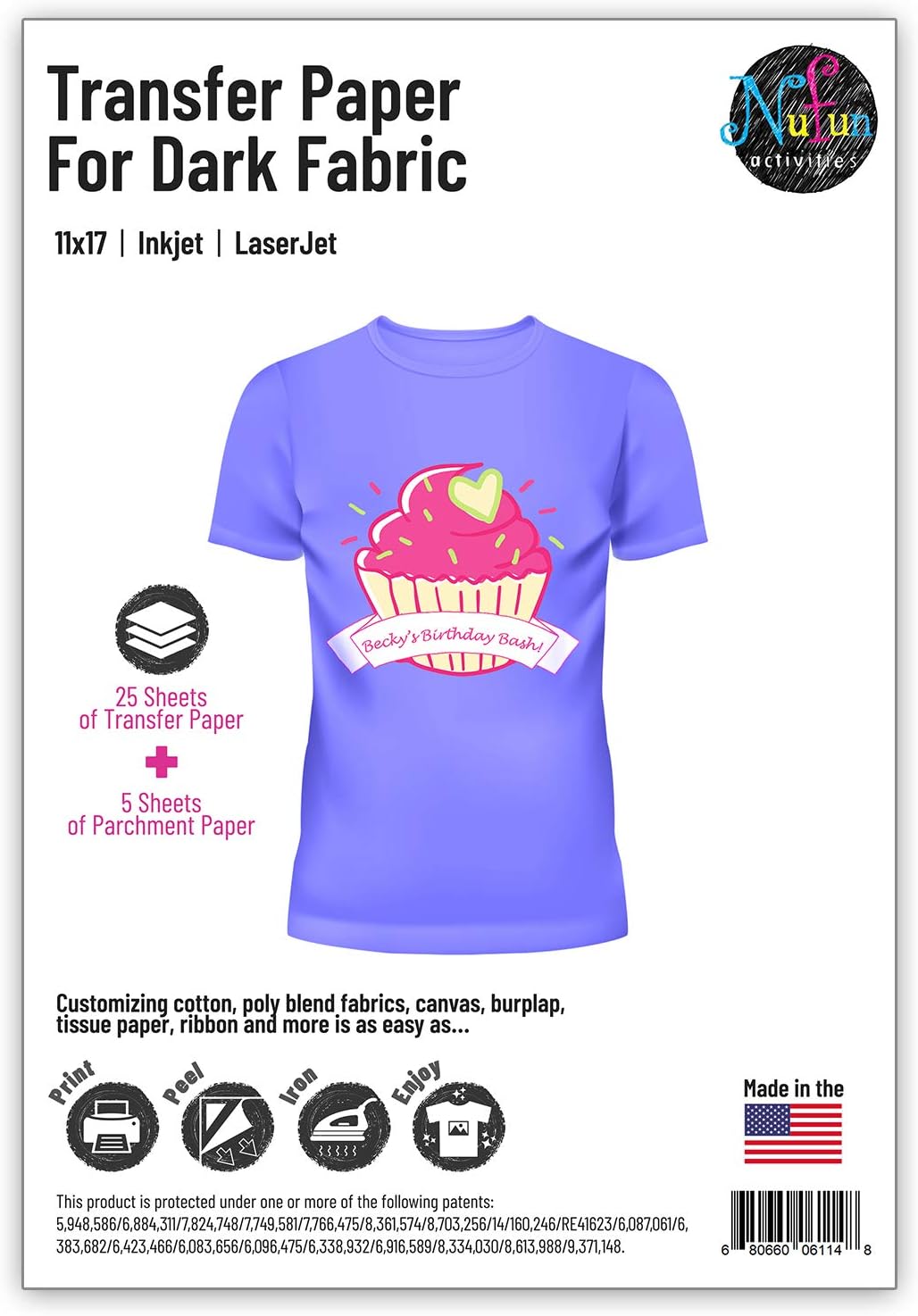 NuFun Activities Inkjet Printable Iron-On Heat Tshirt Transfer Paper 11x17 (25, Dark Fabrics)