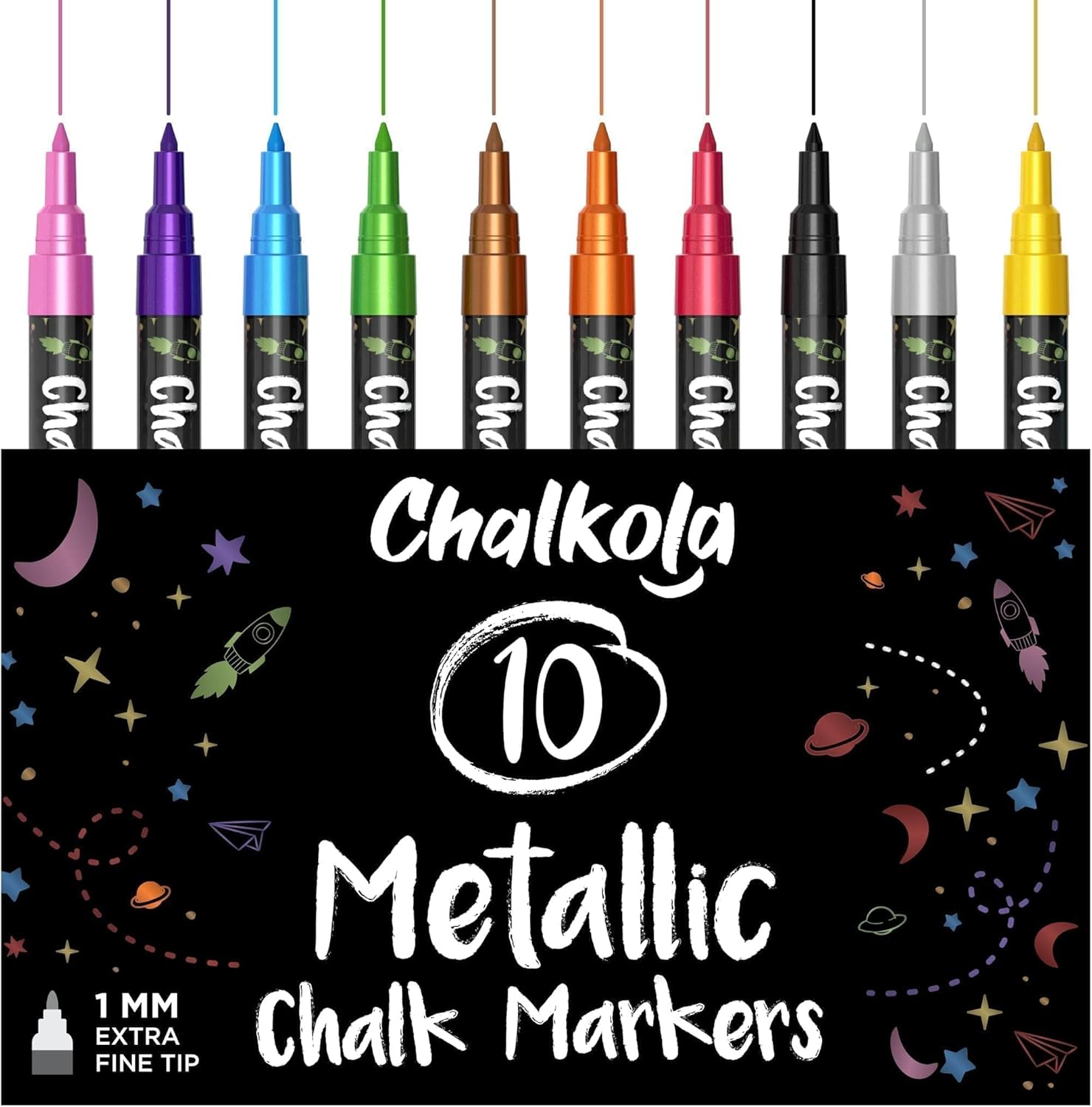 Chalkola Extra Fine Tip Metallic Chalk Markers (10 Pack, 1mm Point) - Liquid Chalk Pens for Chalkboard, Blackboard, Bistro Menu, Car Windows, Glass, Acrylic Board - Thin Erasable Wet Erase Paint Ink