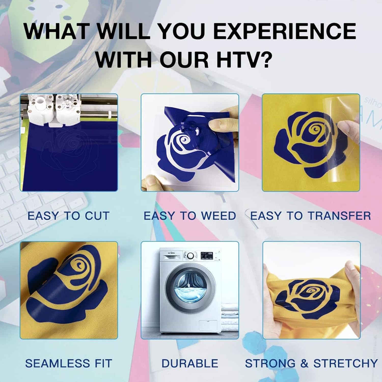 - 【EASY TO CUT WEED TRANSFER】Our premium quality heat transfer vinyl will save time which you may waste on each image or letter, because you can cut and weed easily through the designs just right. The iron on vinyl is sensitive to temperature and pressure, which can be heat transferred to any t-shirt easily. Before cutting, make sure the blade is clean and sharp, so that your design can be cut well and weeding can be done better