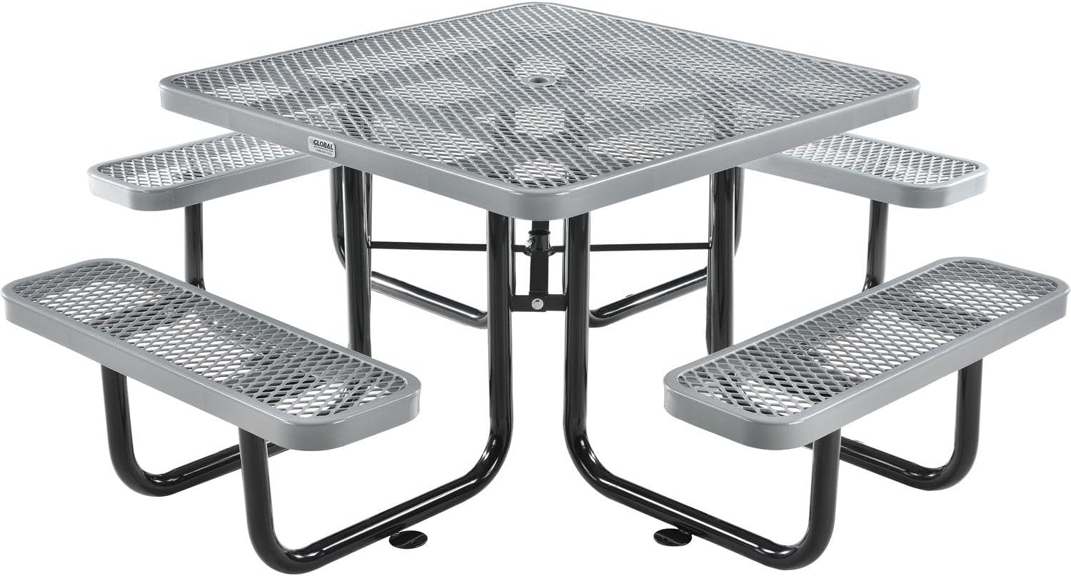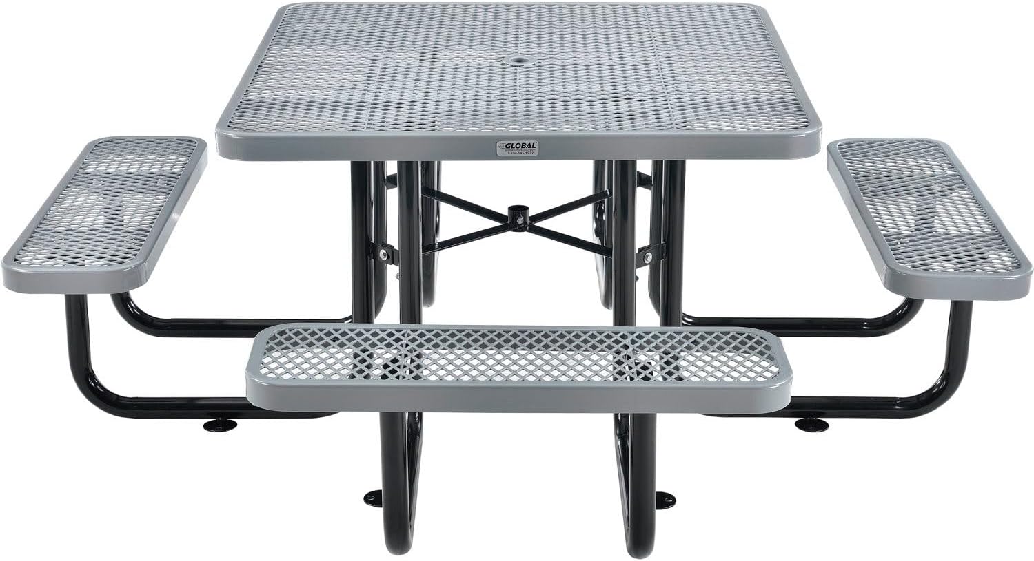 Global Industrial 46" Square Picnic Table, Expanded Metal, Gray Thermoplastic Coating, Attached Benches, 1-1/2” Umbrella Pole Hole, Outdoor-Rated, 1000 lb Capacity