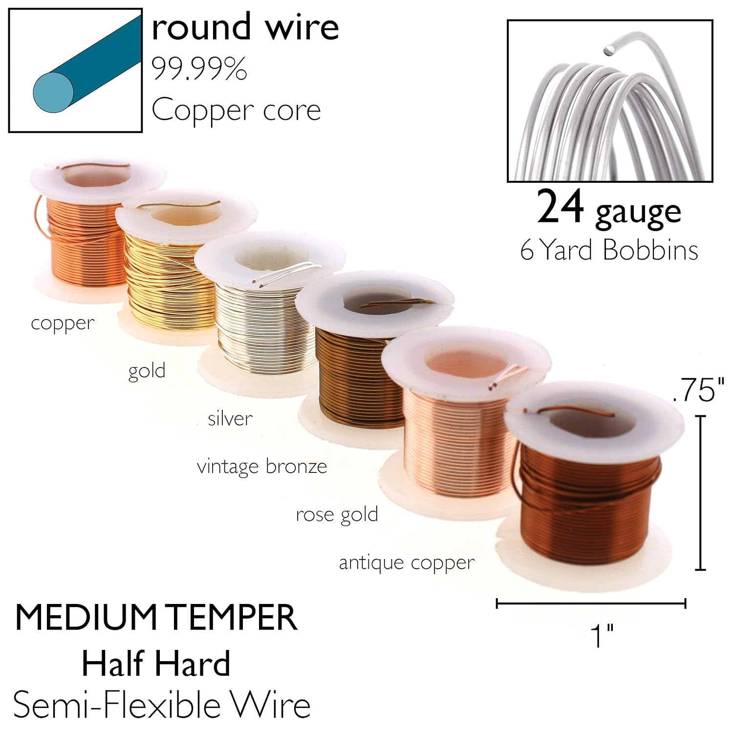 - INCLUDES: This assortment pack of medium temper wire contains six 0.75" (2 cm) mini spools, each containing 6-yards (5.5 m) length of craft wire. It includes 1 gold color, 1 silver color, 1 copper color, 1 rose gold color, 1 vintage bronze color, and 1 antique copper color. Each bobbin of wire is 24 gauge.