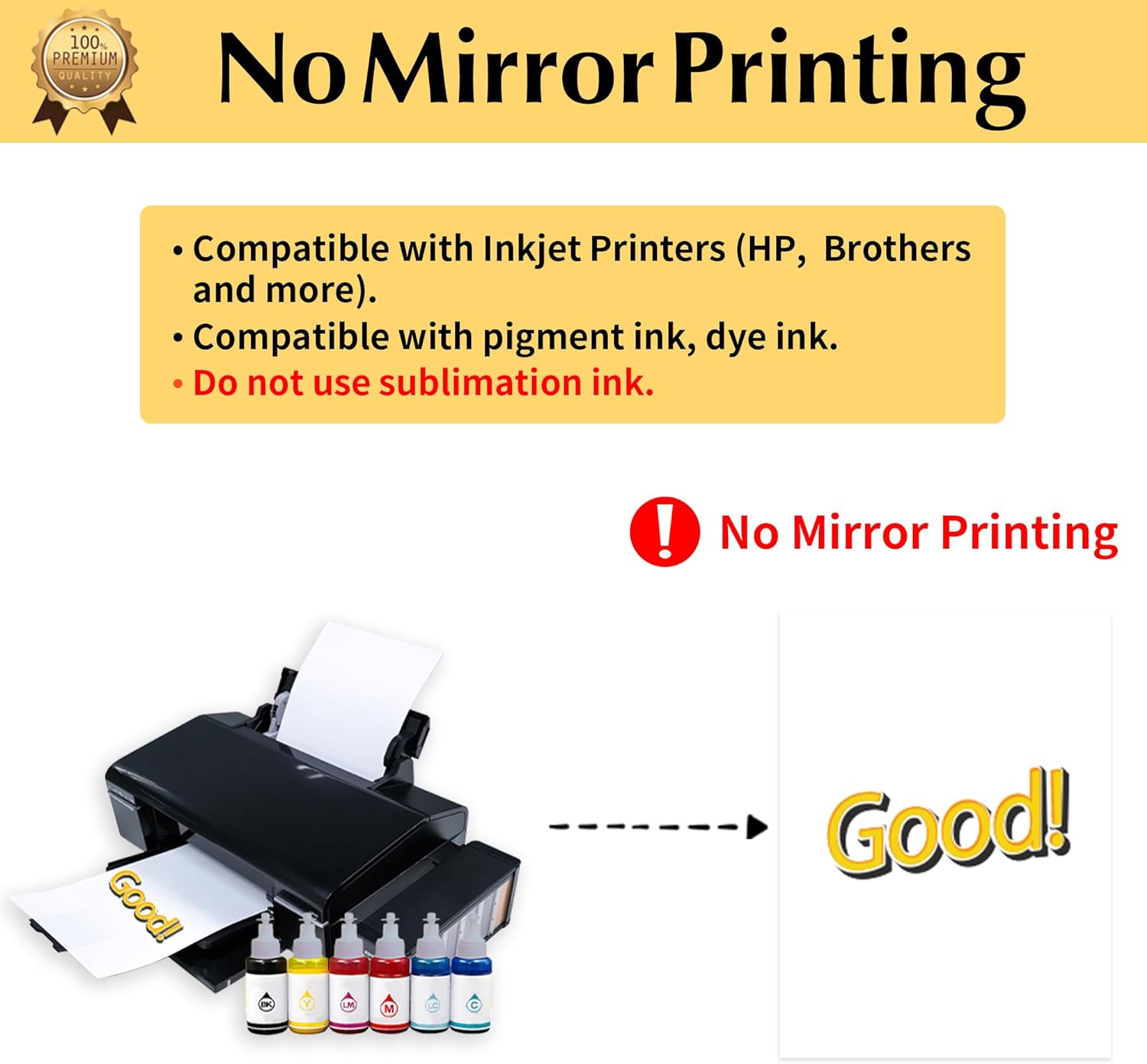 - 💕Requirements: Inkjet Printers (such as HP, Brother and other brands) | Pigment Ink or Dye Ink (Do NOT use sublimation ink) | Scissors or Cutting Machine | Iron or Heat Press machine | Teflon Paper (included in the pack).