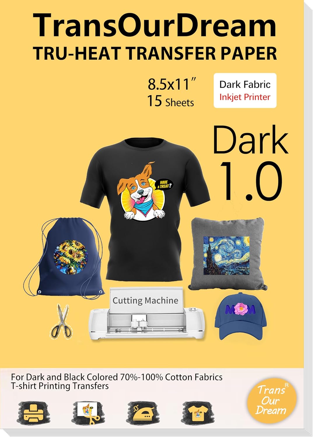 TransOurDream Tru-Iron on Heat Transfer Paper for Dark Fabric (15 Sheets, 8.5x11") T Shirt Transfers Paper for Inkjet Printer Printable Heat Transfer Vinyl for T-Shirts (TOD-7-15)