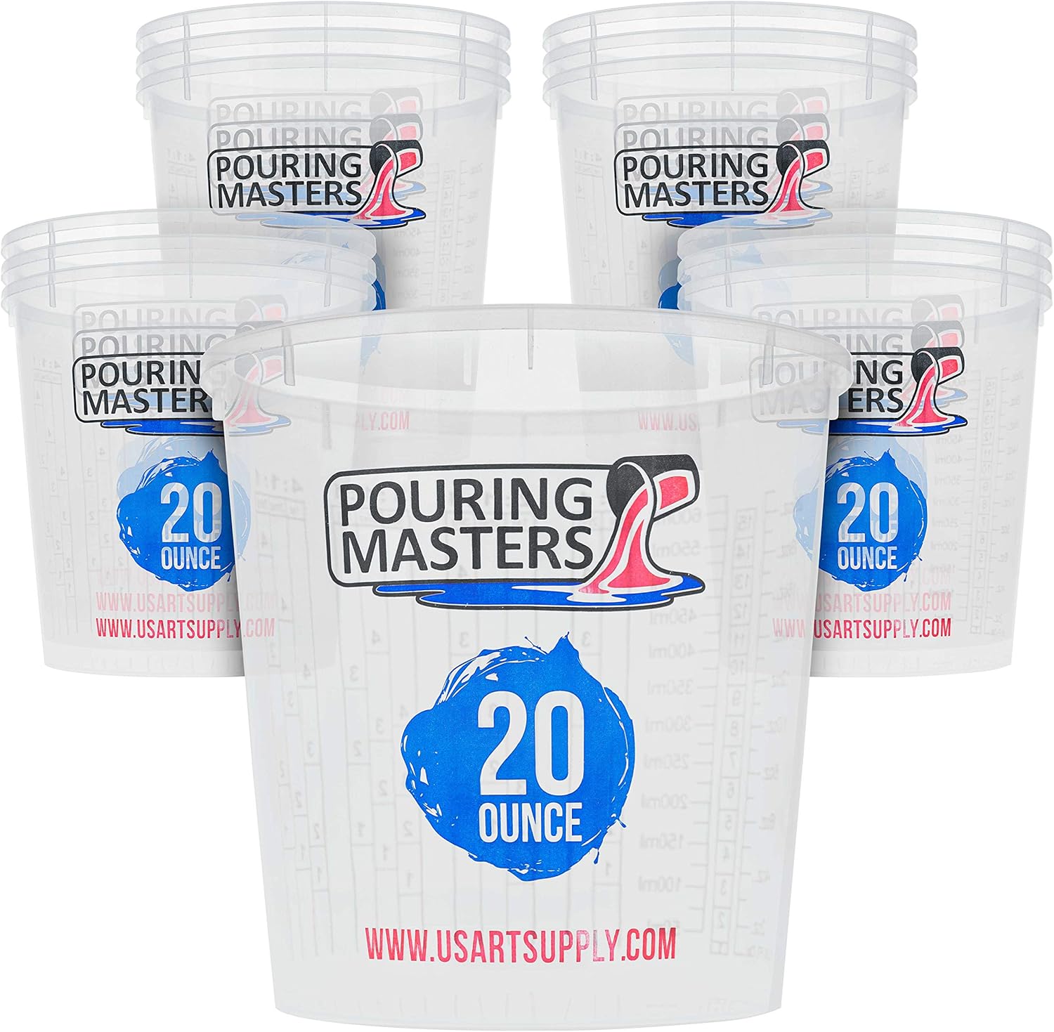 Pouring Masters 20 Ounce (600ml) Graduated Plastic Mixing Cups (Box of 12) - Paint Mixing Cups for Epoxy Resin, Art, Kitchen, Baking - Measurements in OZ and ML, 4 Different Measuring Ratios 1:1