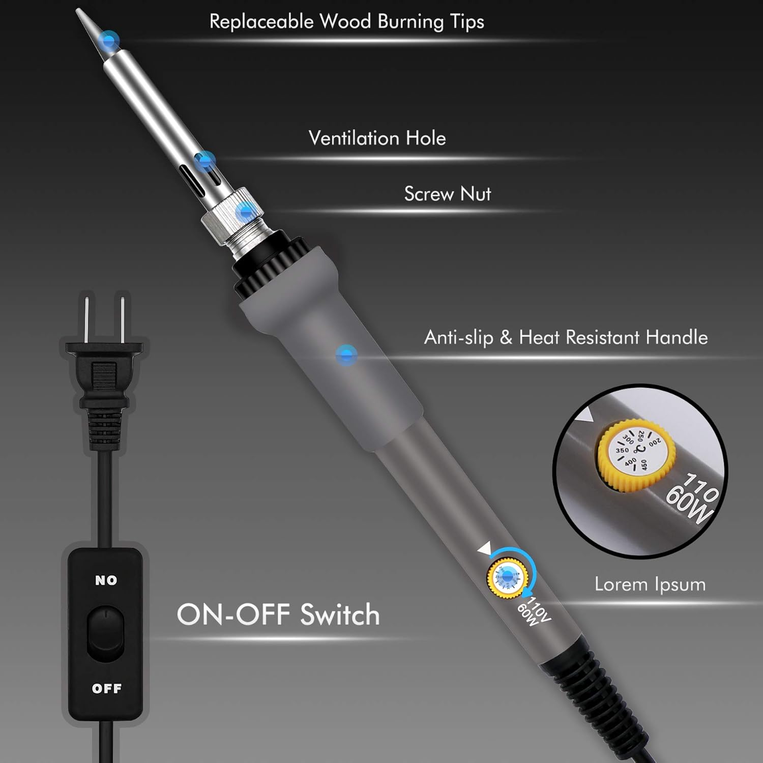 - MULTIFUNCTIONAL USE: The set includes quantity different wood burning tip accessories, templates, wood clices, pencils, gloves, carving on leather, wood, soldering circuit boards. Can be easily used for wood burning beginners