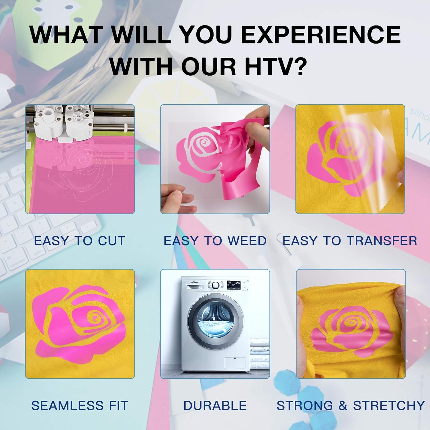 - 【EASY TO CUT WEED TRANSFER】Our premium quality heat transfer vinyl will save time which you may waste on each image or letter, because you can cut and weed easily through the designs just right. The iron on vinyl is sensitive to temperature and pressure, which can be heat transferred to any t-shirt easily. Before cutting, make sure the blade is clean and sharp, so that your design can be cut well and weeding can be done better