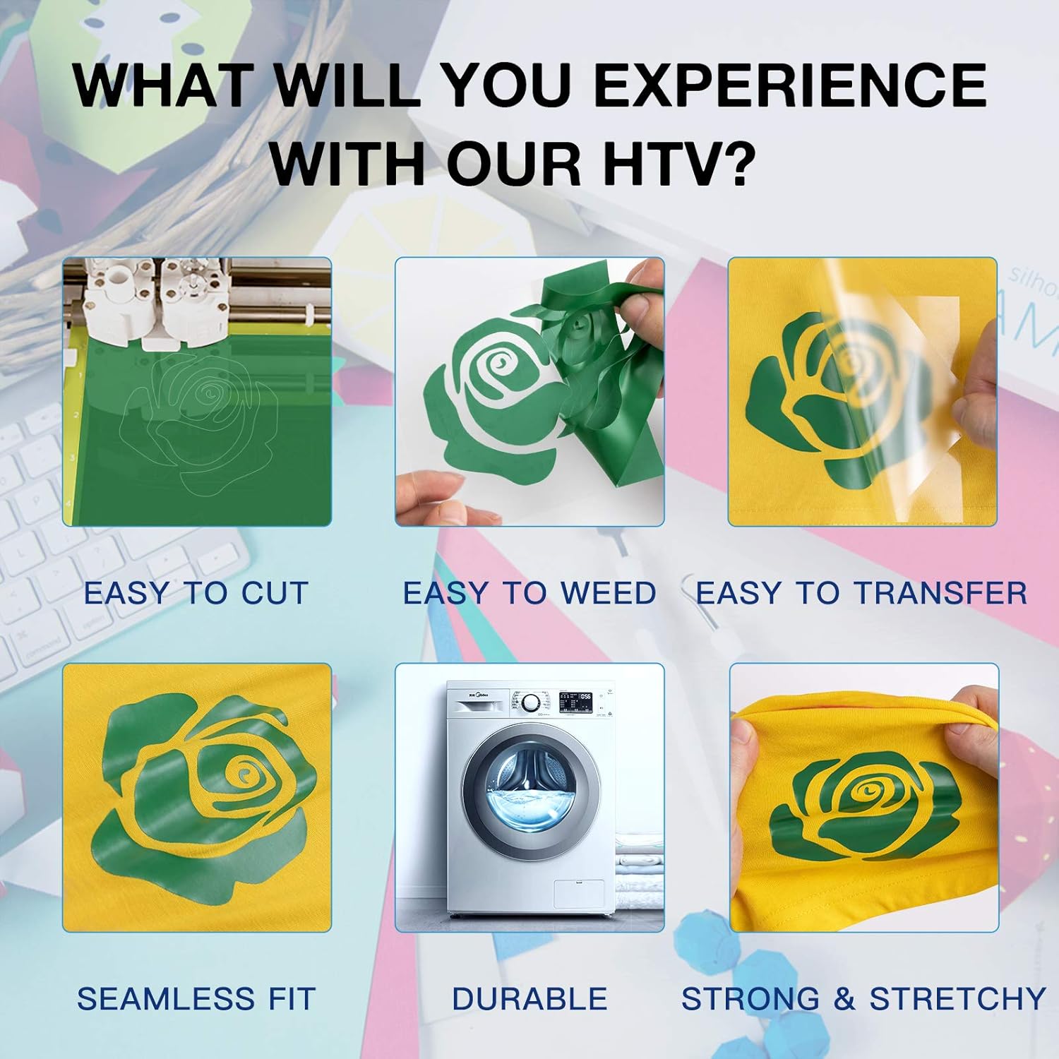 - 【EASY TO CUT WEED TRANSFER】Our premium quality heat transfer vinyl will save time which you may waste on each image or letter, because you can cut and weed easily through the designs just right. The iron on vinyl is sensitive to temperature and pressure, which can be heat transferred to any t-shirt easily. Before cutting, make sure the blade is clean and sharp, so that your design can be cut well and weeding can be done better