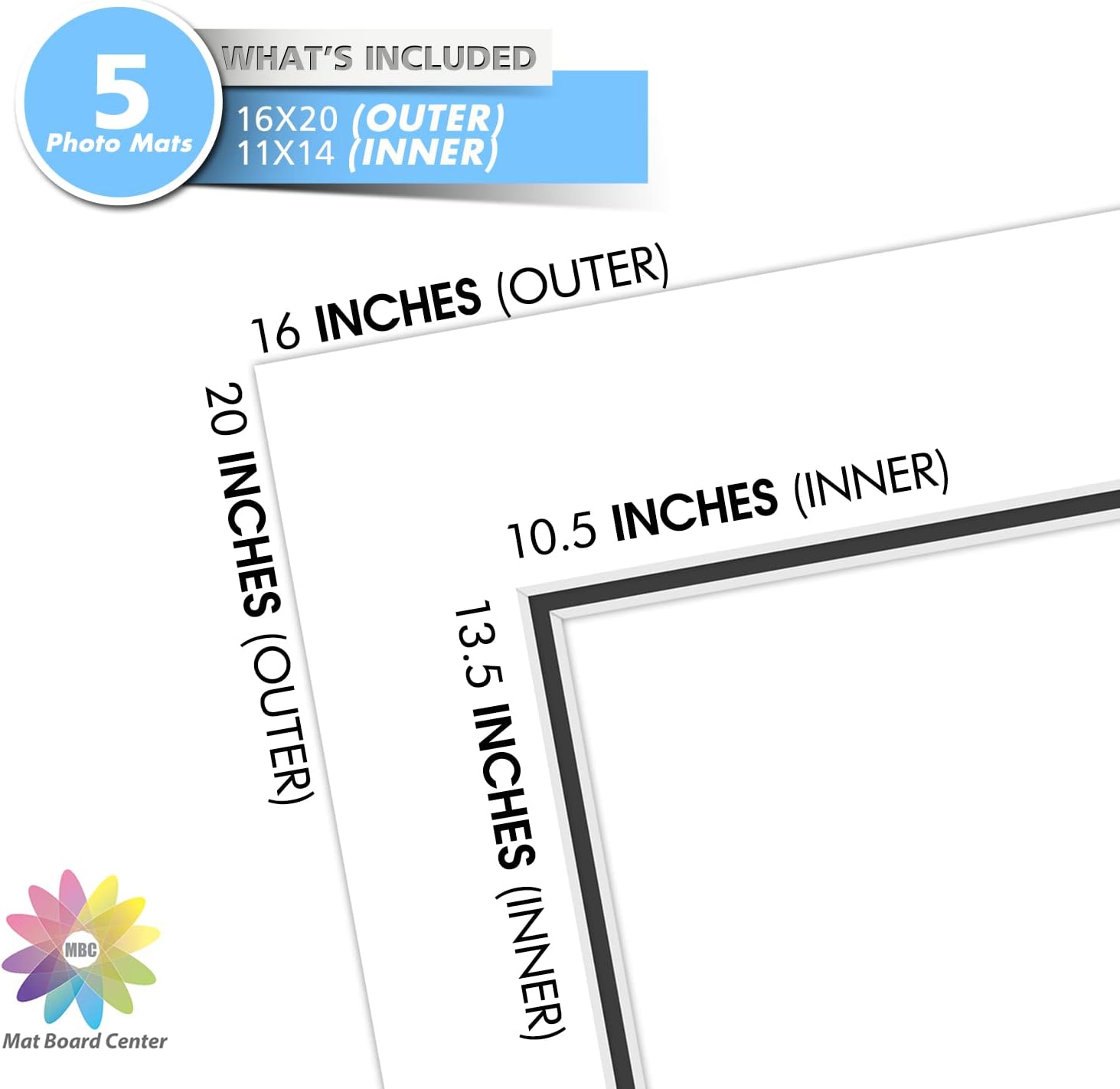 Mat Board Center, Double Mat - Acid Free, 8-ply Thickness, White Core - for Pictures, Photos, Framing (White Over Black, 16x20 for 11x14, Pack of 5)