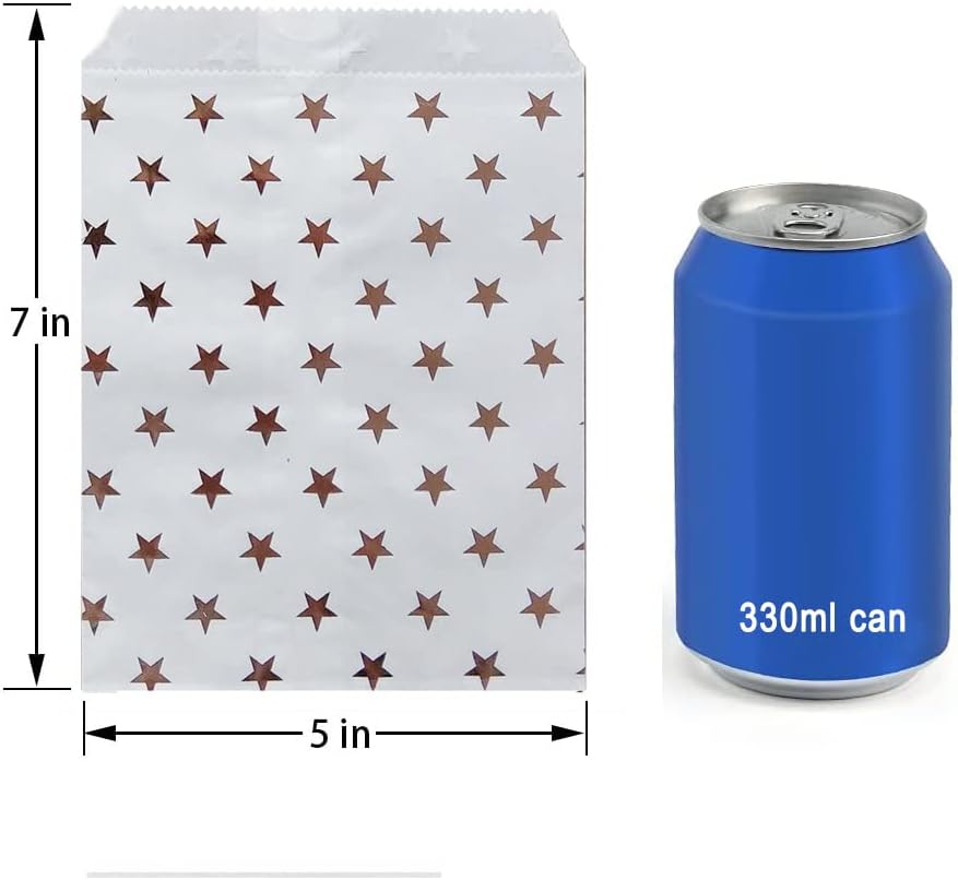 - Color and Size: Rose gold candy buffet bags 5 inches wide and 7 inches high. The size allows for convenience in packing and gifting, ensuring your treats stand out