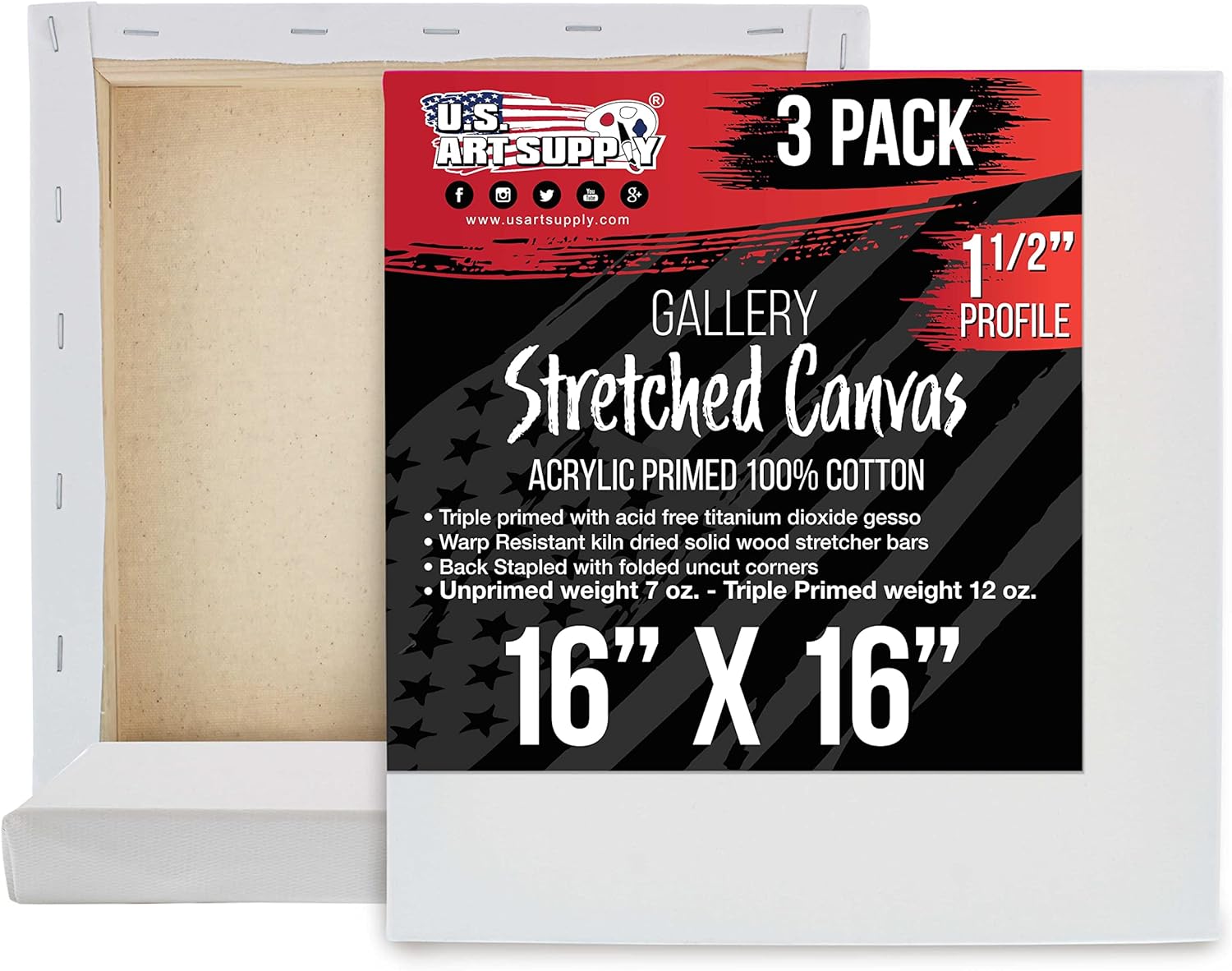 U.S. Art Supply Large Stretched Canvas for Painting 16x16 inch Gallery Depth 1-1/2" Thick, 3-Pack - 12oz Acrylic Gesso Triple Primed, Professional Artist Quality, 100% Cotton - Oil, Pouring Paint