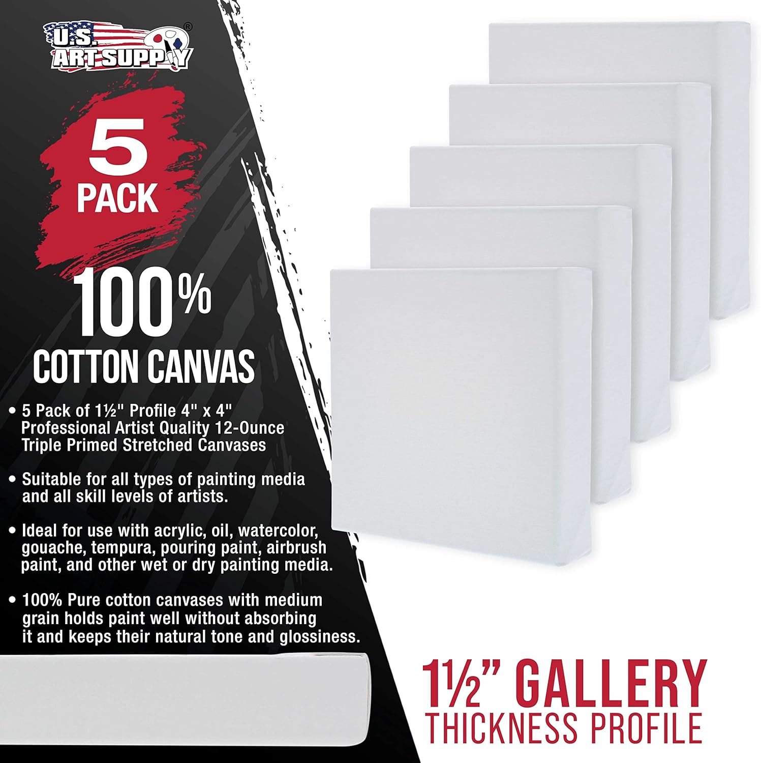 U.S. Art Supply 5-Pack Bulk Stretched Canvas for Painting 4 x 4 inch, Gallery Depth 1-1/2" Profile - 12oz Acrylic Gesso Triple Primed, Professional Artist Quality, 100% Cotton - Oil, Pouring Paint