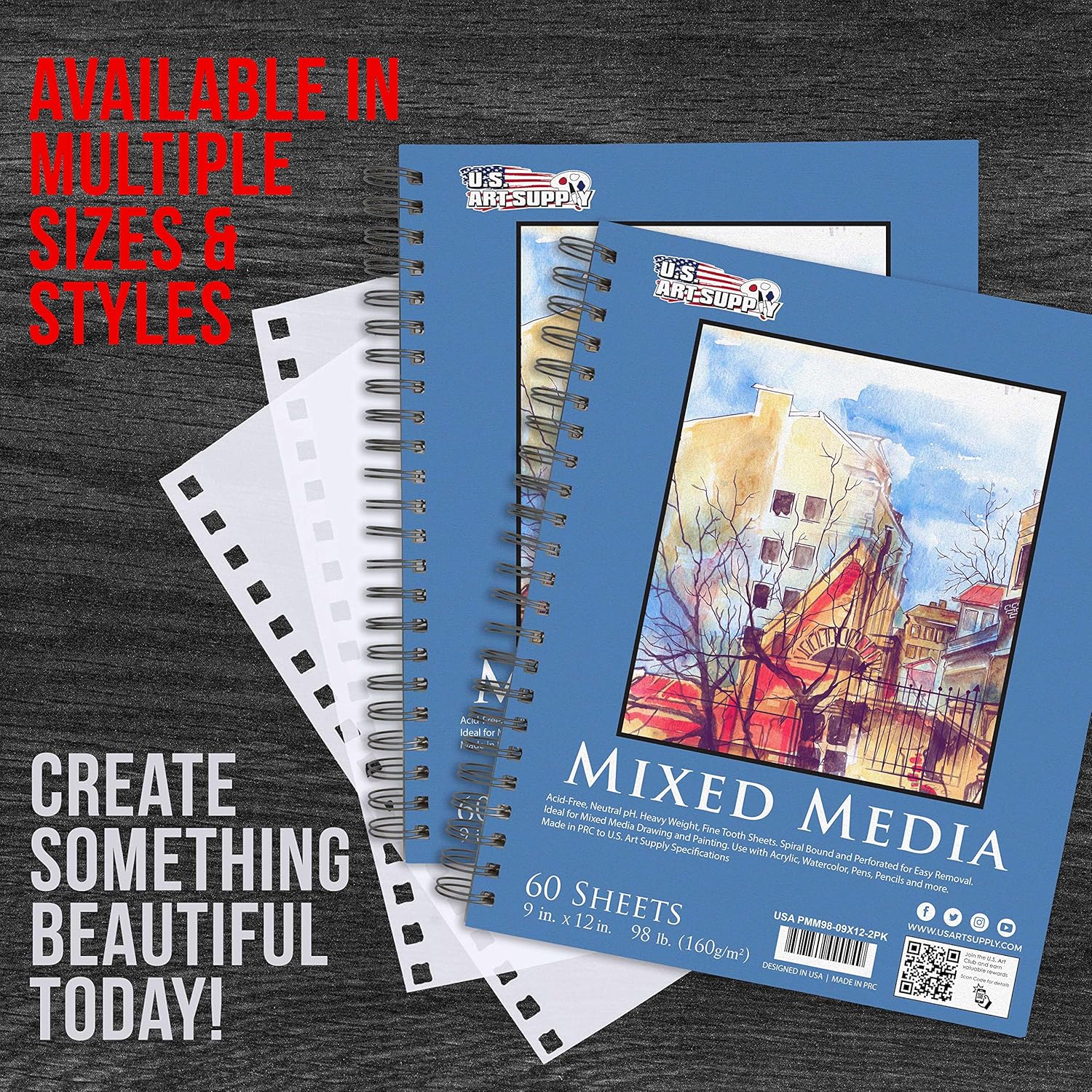 U.S. Art Supply 9"x12" Mixed Media Sketchbook, 2 Pack (60 Sheets), 98 lb (160 GSM) - Spiral-Bound Pad with Perforated Acid-Free Paper - Artist Sketch Book for Drawing, Painting, Watercolor