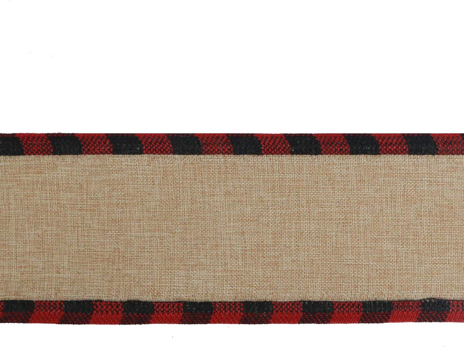 - Our elegant 2-1/2 inch burlap wired ribbon features a sophisticated red and black gingham edging, measuring a generous 10 yards in length. This ample material makes it perfect for a variety of creative endeavors. Its natural texture, combined with the timeless appeal of gingham, creates a classic and stylish look, adding a touch of rustic charm to your projects.