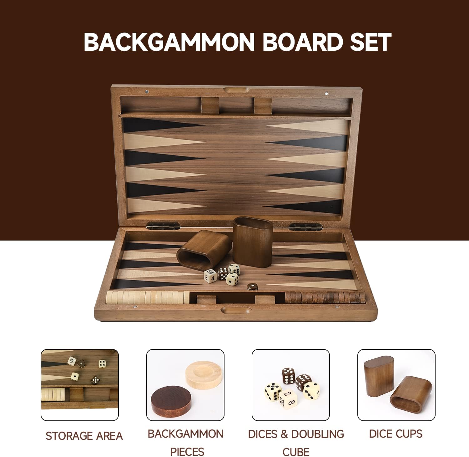 - Complete Set: The wooden backgammon game set includes a folding backgammon game board, a complete set of 15 milky white and 15 coffee colors backgammon game pieces, two large wooden dice cups, two pairs of dice, a doubling cube, and game instructions