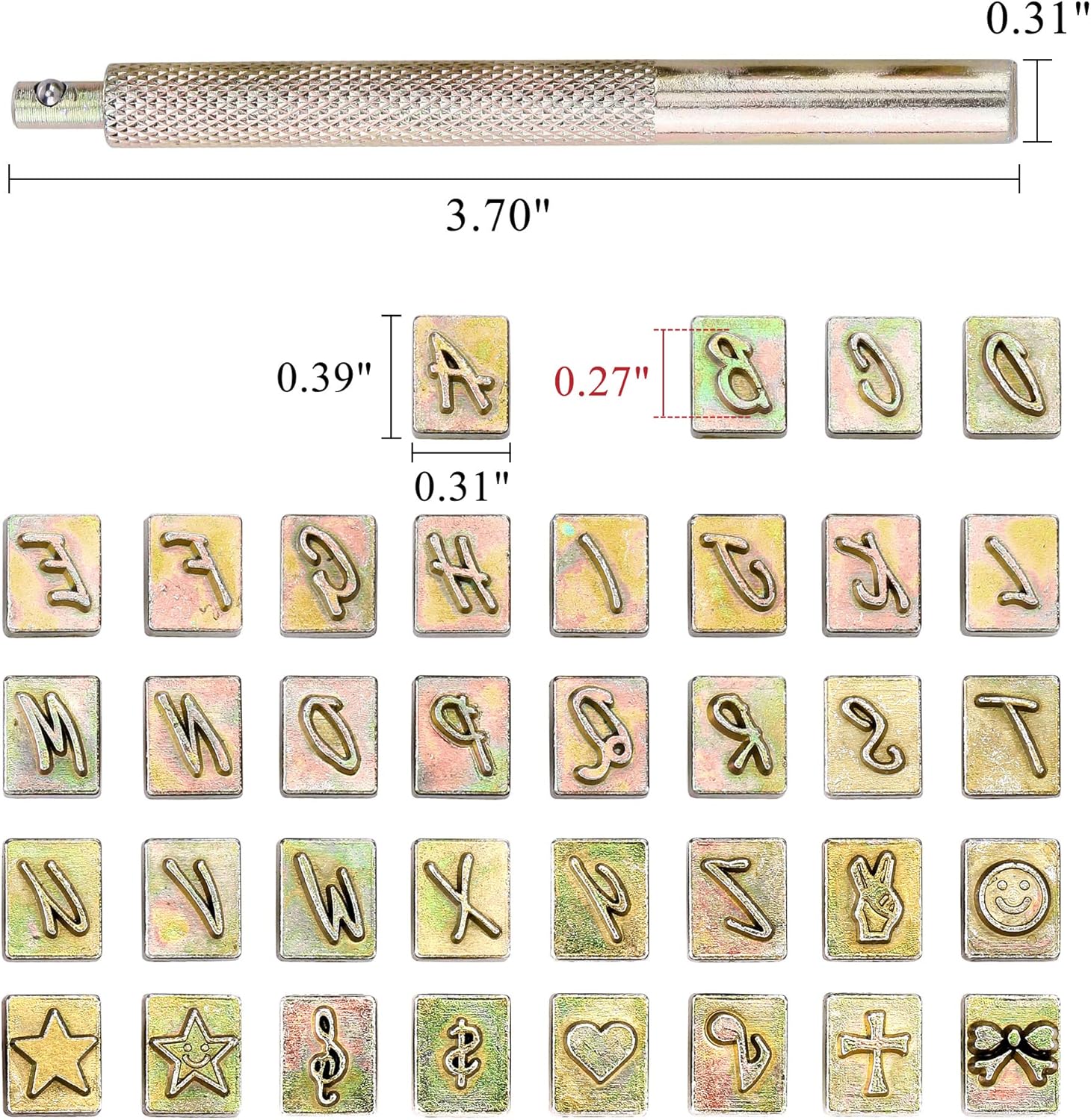 - 37Pcs/Set leathercarft stamping tool, including 26 Pcs a-z alphabet letters + 10 Pcs patterns + 1 stamping handle. It's easy and fun to stamp designs in leather with these tools.