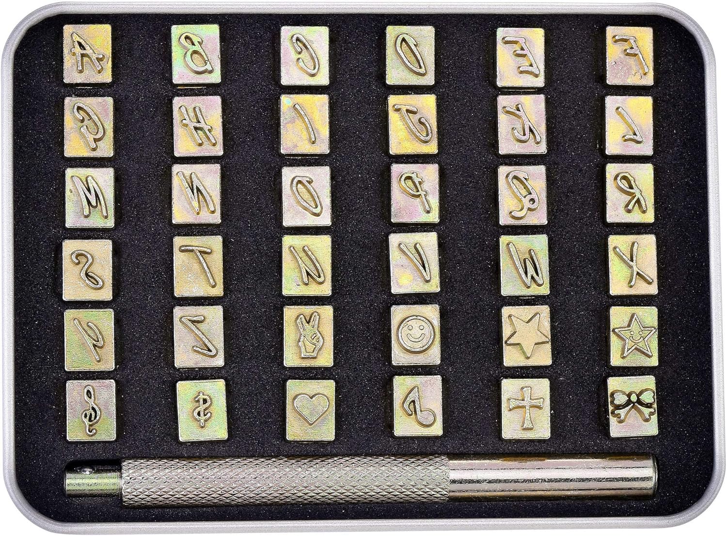 Yoption 37 Pieces Leathercarft Stamping Tool Set, 26 Letters Alphabet & 10 Patterns Stamping Tool 6mm +1 Stamping Handle for Leather Craft