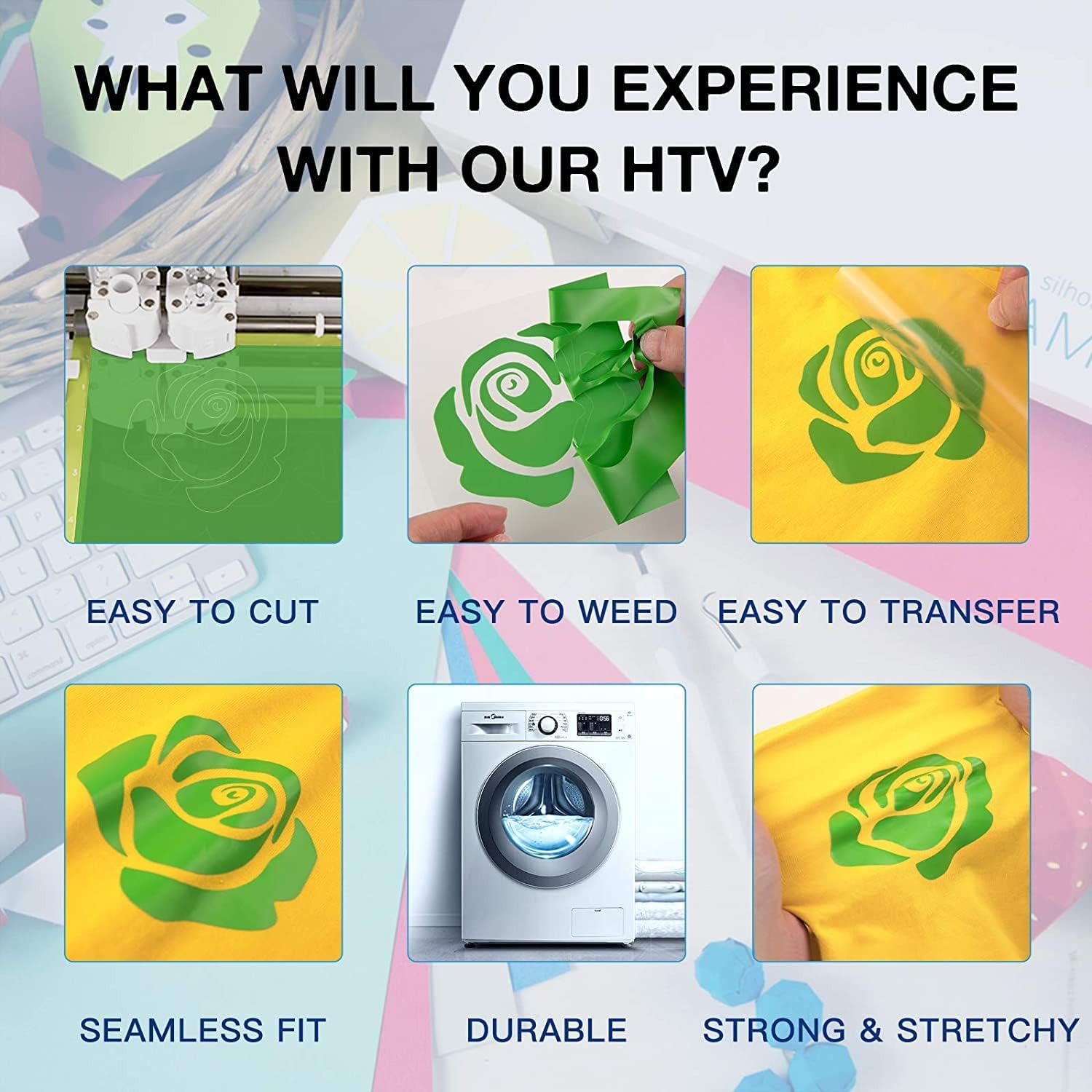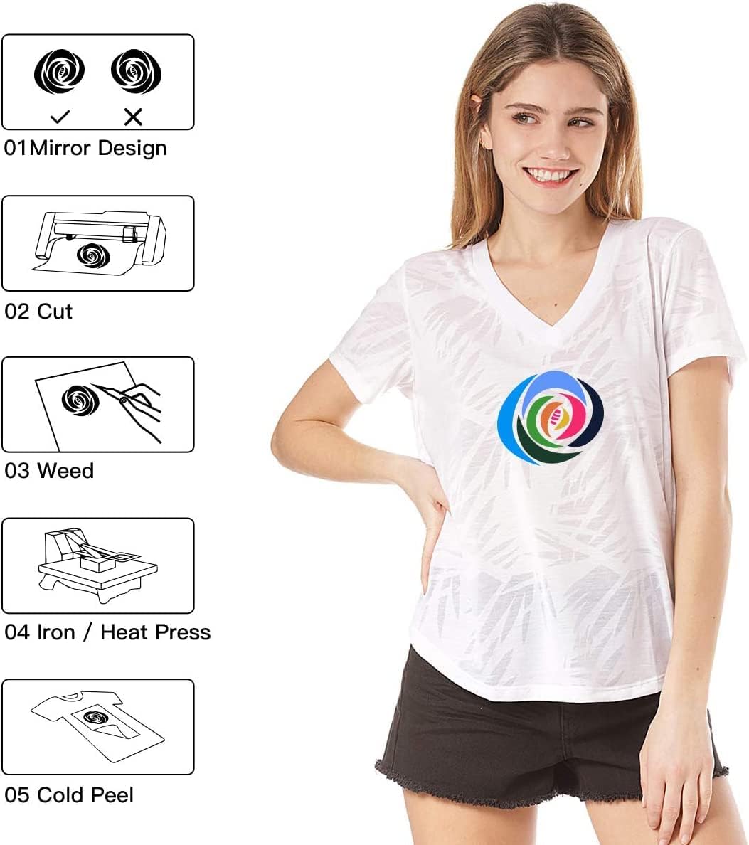 - 【EASY TO CUT WEED TRANSFER】Our premium quality heat transfer vinyl will save time which you may waste on each image or letter, because you can cut and weed easily through the designs just right. The iron on vinyl is sensitive to temperature and pressure, which can be heat transferred to any t-shirt easily. Before cutting, make sure the blade is clean and sharp, so that your design can be cut well and weeding can be done better