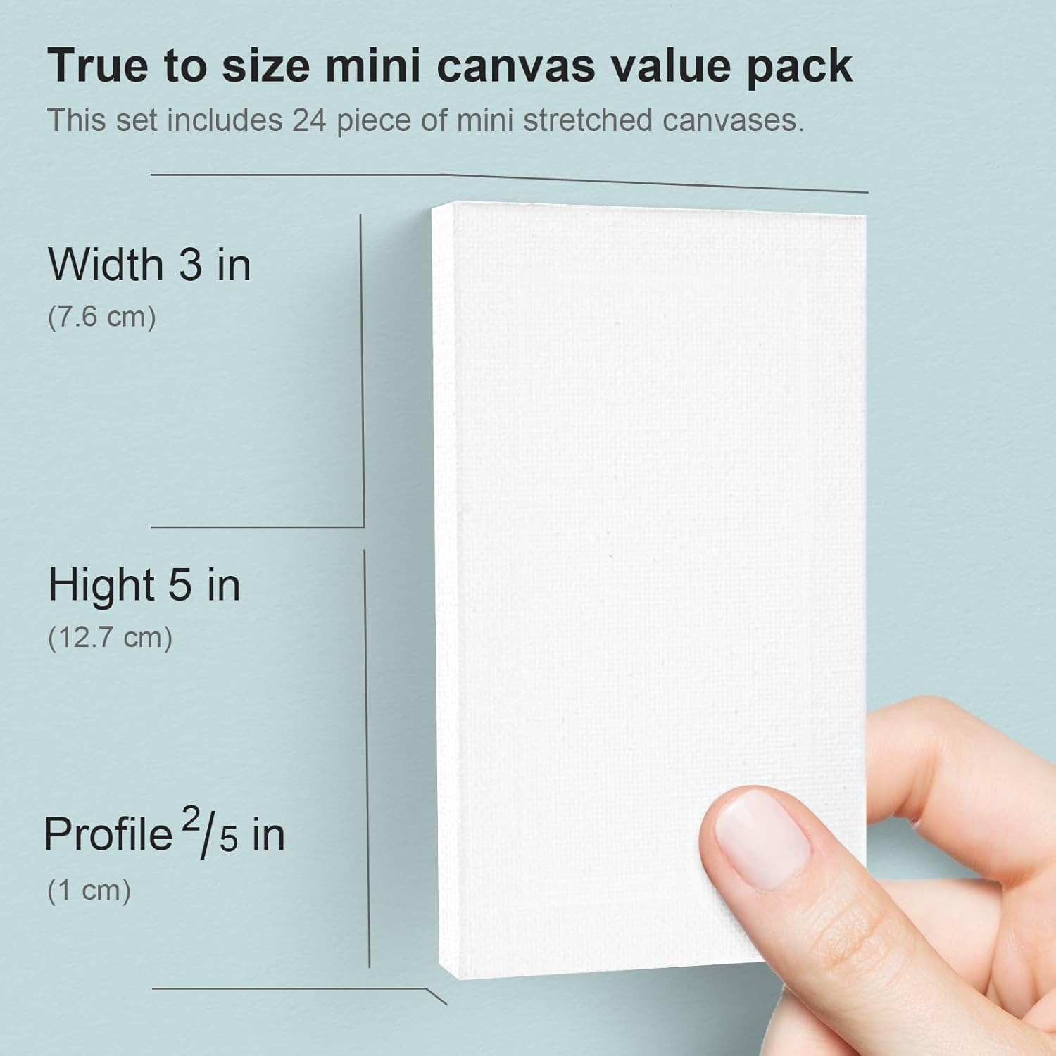 - SPECIFICATIONS - CANVAS SIZE - 3x5 inch; PROFILE - 2/5 Inch; UNPRIMED WEIGHT - 4oz., PRIMED WEIGHT - 8oz.; PACK - 24. Lightweight, easy to handle, carry, and display. Great for home projects, classroom art activities, and other decorating projects. Perfect painting canvas for artists, students, beginners.