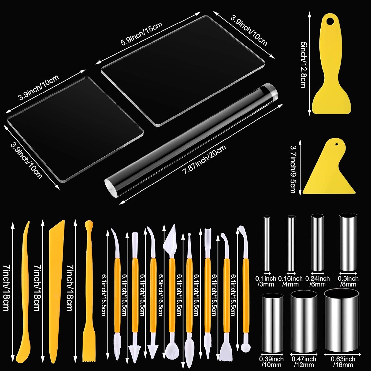 - Specific Contents: 24 pieces clay sculpting tool kits, including 1 acrylic clay roller, 2 acrylic sheets, 2 plastic scraper backing boards, 7 stainless steel round circle shape cutters, 12 polymer clay shaping and sculpting tools, nice combinations to meet your different DIY purposes; Warmly noted: in order to protect our acrylic sheets, there are 2 protective films on the surface of acrylic sheets, which can be torn before use