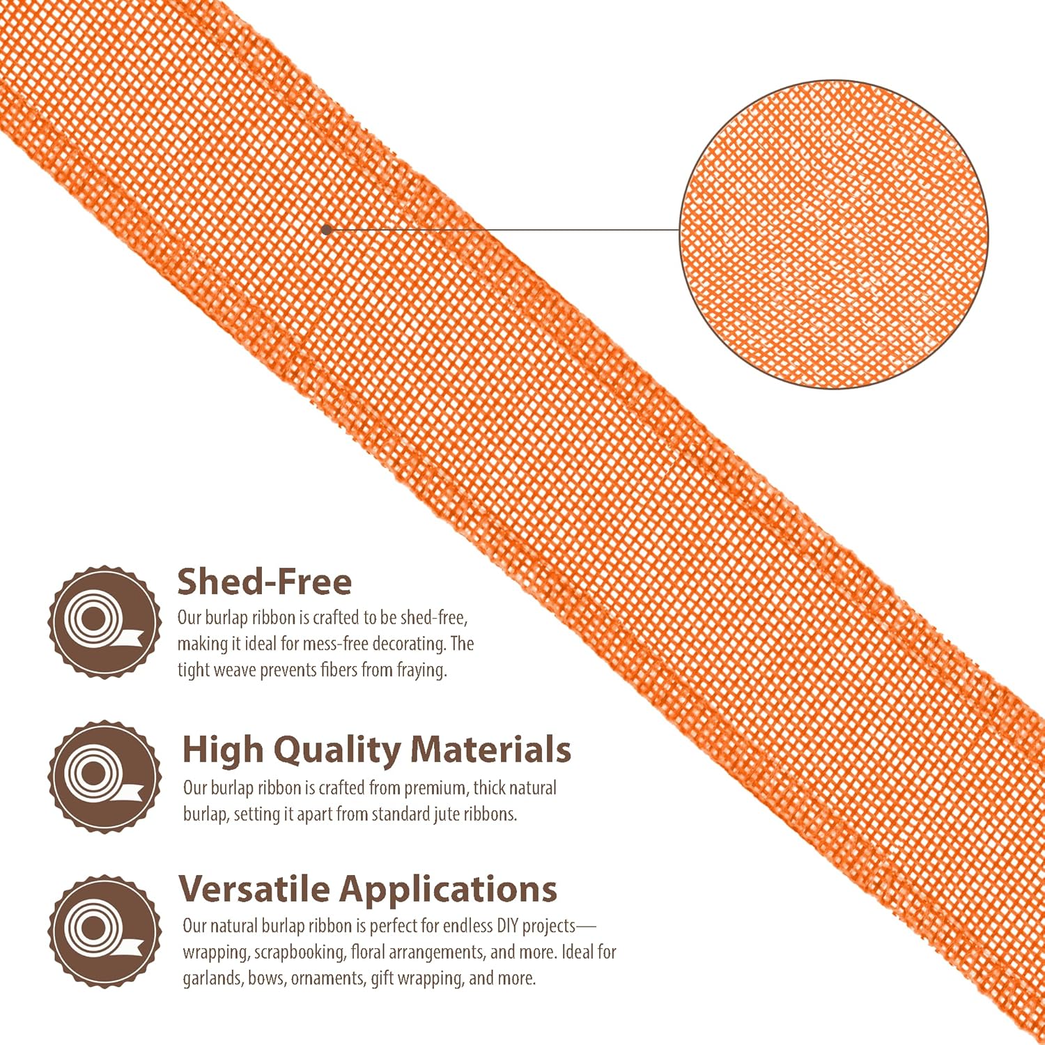 - Wired Burlap Ribbon: Compared to other jute burlap ribbons, our rustic burlaps ribbon with a fray & shed-resistant hemmed edges is made from thicker orange burlap fabric. The indoor & outdoor colored burlap crafts ribbon is colorfast and will not bleed.