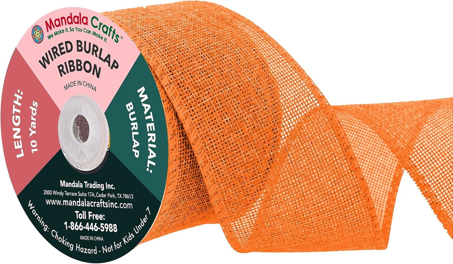 Mandala Crafts Orange Burlap Wired Ribbon 2.5 Inches Wide Jute Ribbons for Crafts - 10 Yds Roll Rustic Burlap Wrap Trim Ribbons for Wreaths Bows Party Decoration