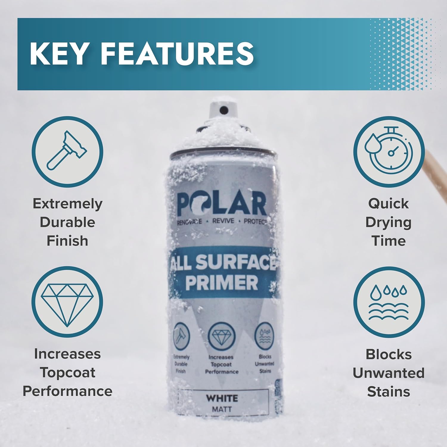 - Enhanced All Surface Primer: Polar All Surface Primer Spray Paint is a high-build primer resistant to chipping, peeling, and fading. Our spray paint primer is the perfect preparatory primer for interior and exterior surfaces before applying topcoat paint.