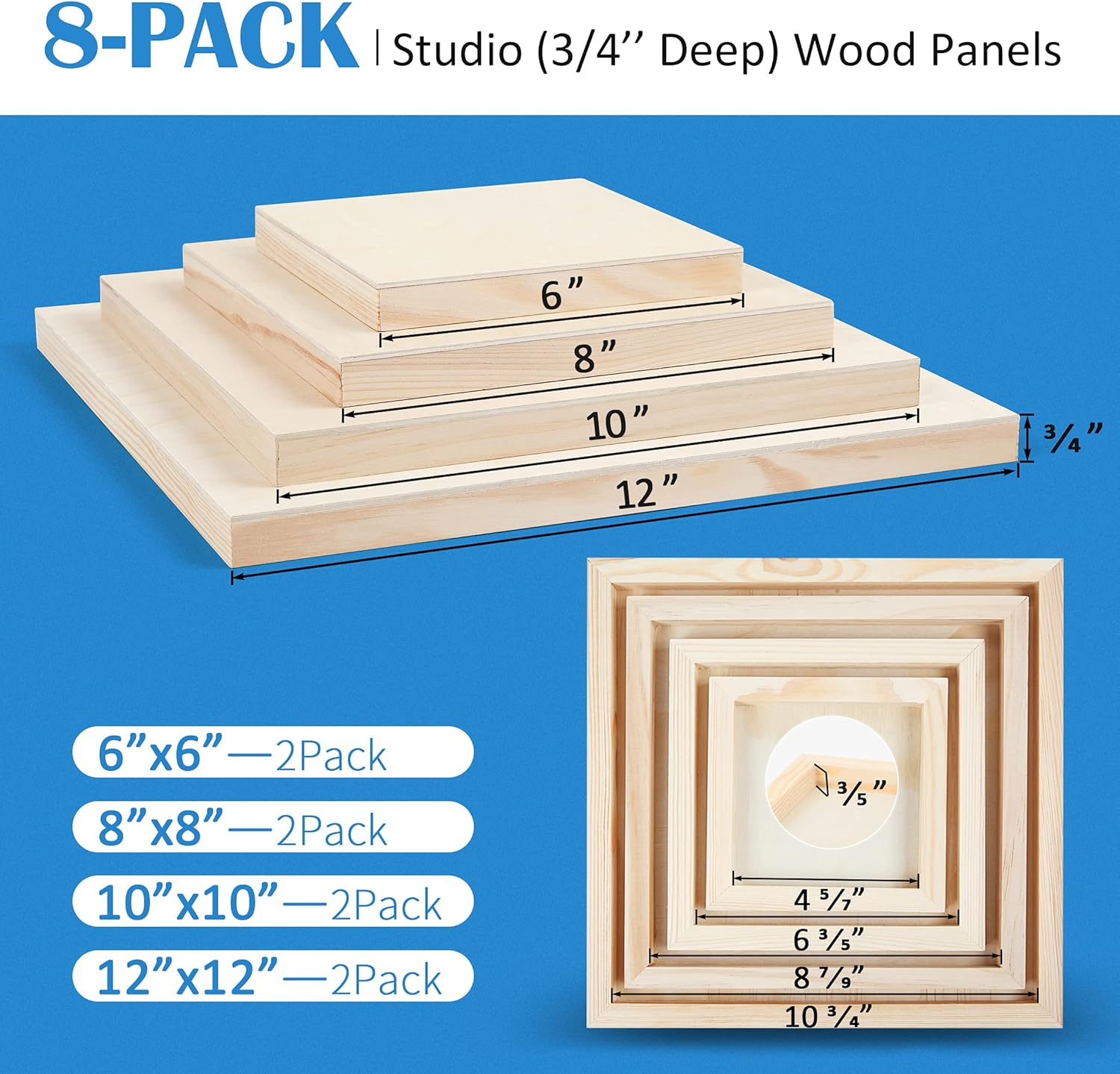 Falling in Art Unfinished Birch Wood Canvas Panels Kit, 8 Pack of 4 Sizes Studio 3/4’’ Deep Cradle Boards for Pouring Art, Crafts, Painting, and More
