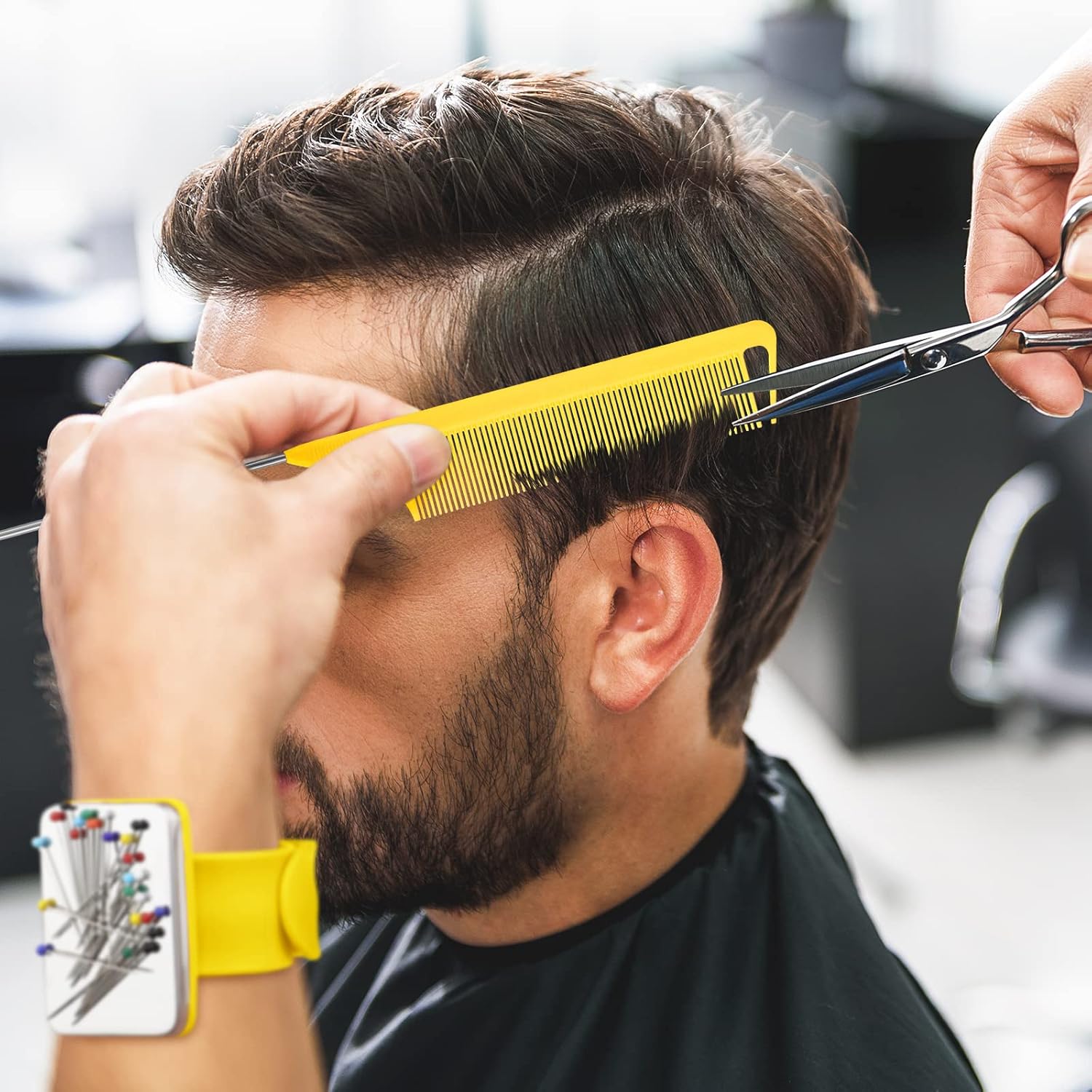 WILLBOND Magnetic Wrist Sewing Pincushion Wrist Magnetic Pin Holder Wristband Pin Cushion Holder with 3 Pcs Stainless Steel Pintail Comb Rat Tail Comb for Hair Clips Hand Sewing(Yellow)