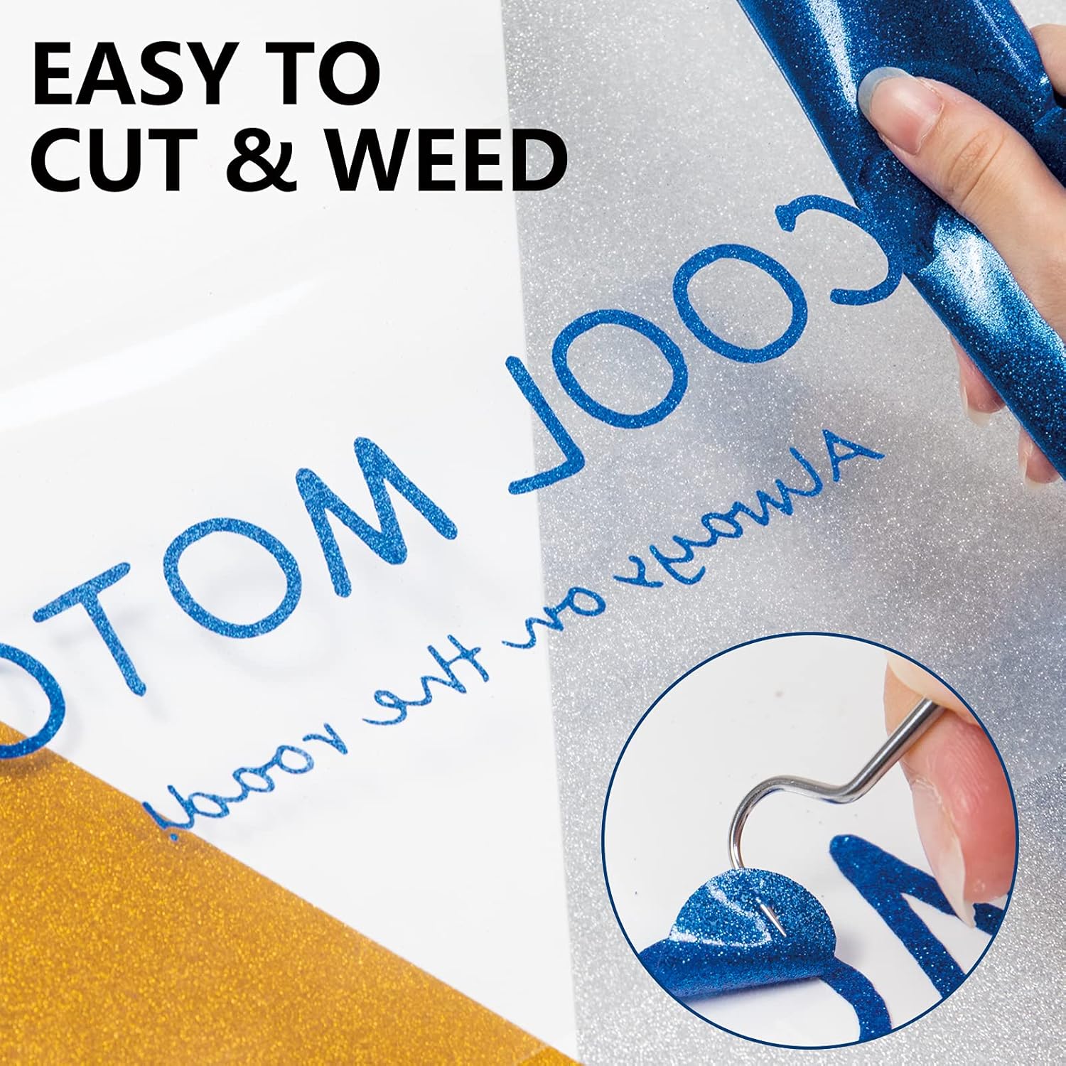 - 【EASY TO CUT WEED TRANSFER】The glitter htv is thick with an excellent cutting application characteristics, any cutters’ blade can cut it through easily. The medium tack transfer film makes weeding like a dream, the glitter heat transfer vinyl is extremely sensitive to heat and pressure makes transfer quickly, which will save your time. The glitter iron on vinyl is sensitive to temperature and pressure, which can be heat transferred on any t-shirt easily
