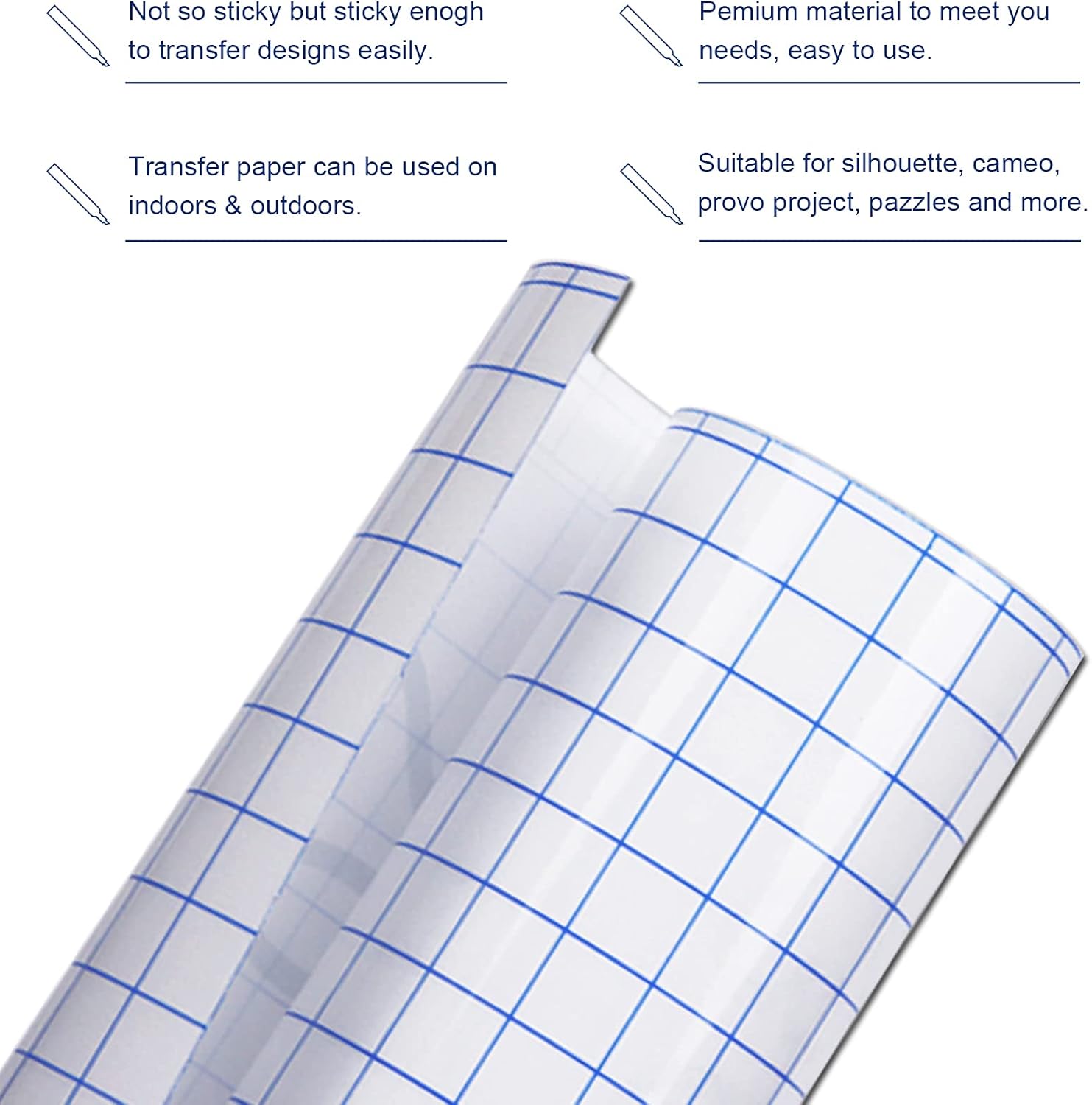 - 【Clear Blue Square Grid】The transfer paper tape has clear blue grid lines on transparent sticky side, easy to measure when you cut the paper, you can clearly see the pattern you need to cut, and without waste the vinyl transfer paper tape roll