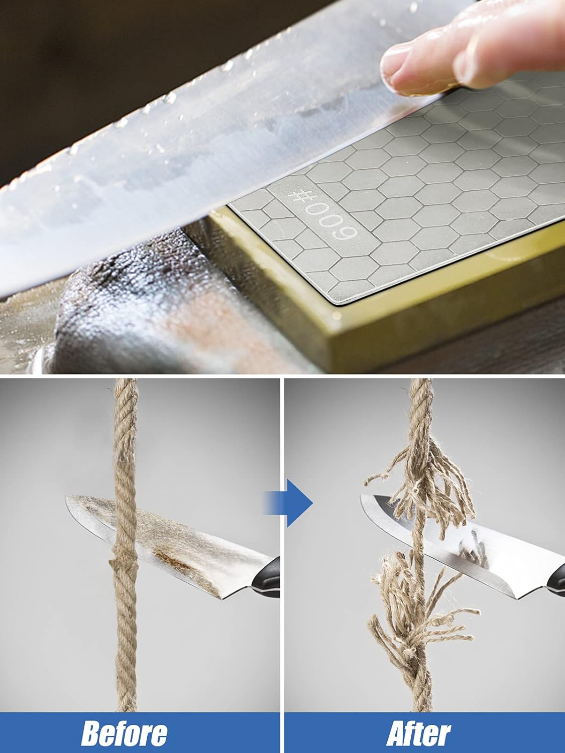 - Unique Design: The unique honeycomb design ensures that the dust generated during the grinding process will not affect the sharpening. The diamond sharpening stone has a non-slip silicone base to ensure that it will not slip during use, and it is very lightweight to carry it. You can put it wherever you need to use easily and conveniently.