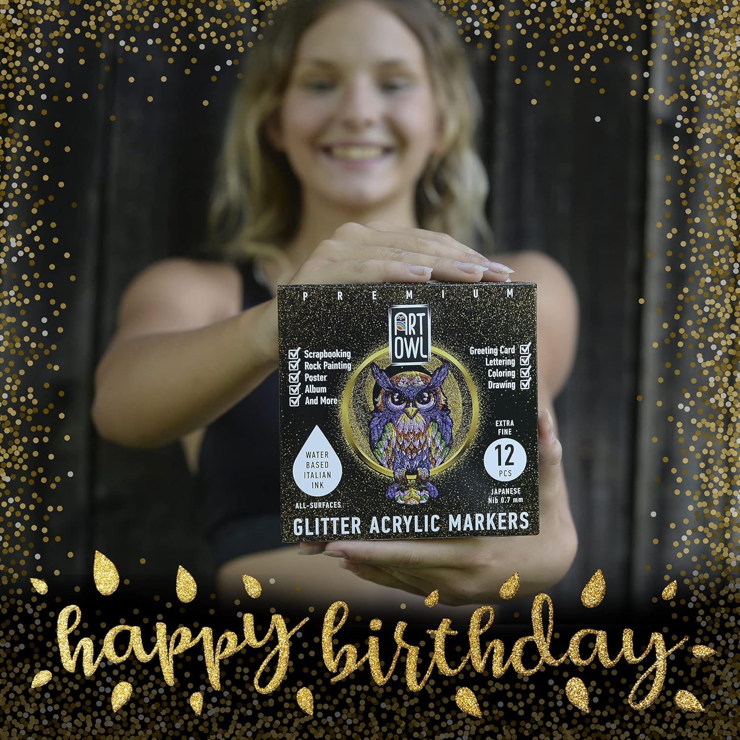 Acrylic Glitter Paint Marker Pens, Ultra Fine Point 0.7mm - Sparkle Paint Pens for Rock Painting, Stone, Ceramic Glass, Wood, Card Stock, Canvas, DIY Crafts - Set of 12
