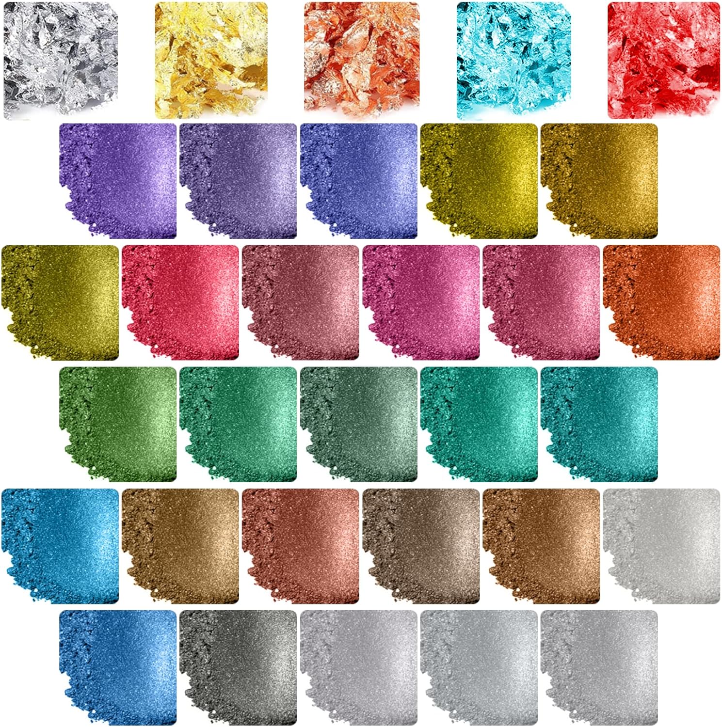 - 【STUNNING COLORS】: SigWong Mica Powders Set Include: 27 colors mica powders 5g/0.18oz and 5 colors gold foil flakes 1g. The gold foil flakes are gold, silver and copper colors, which are not easy to fade and oxidize, they can be paired mica powder create a stunning shiny textured effect to make your crafts look special. So let your imagination run wild and add some color to your life.