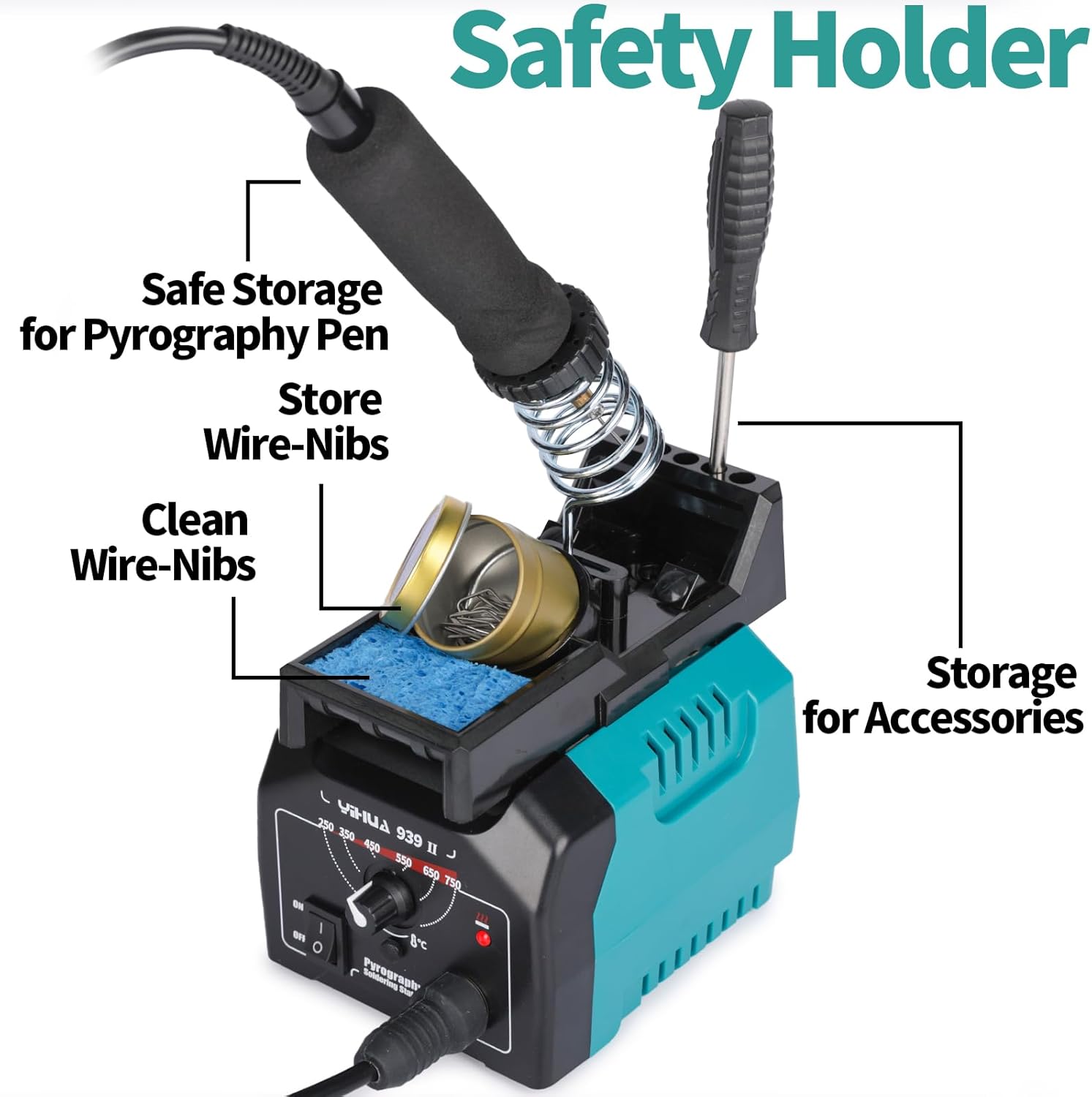 YIHUA 939-II Wood Burning Kit Station Pyrography pen 250~750℃/482~1382℉ Temperature Adjustable with 20 Wire Nibs, 1 stable pen holder, 2 stencils, 2 scrap wood, 1 S/S Tweezers, and 1 pliers (Green)