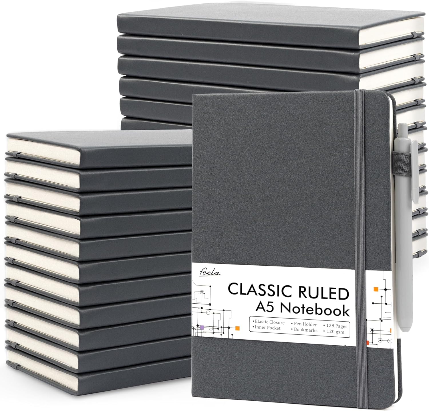 feela 24 Pack Journal Notebook for Work, Business Notebook Bulk Hardcover Lined Writing Journal with Pen Holder for Men Women Note Taking, with 24 Black Pens, 120 GSM, 5.1”x8.3”, A5, Gray