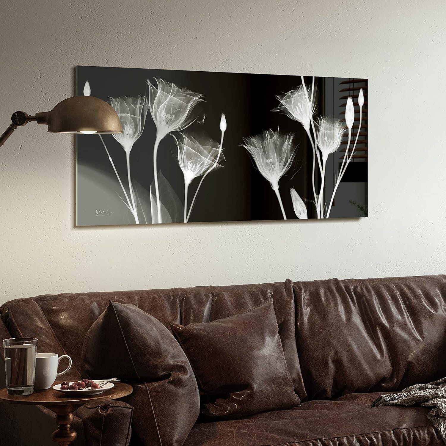 - FLOWER, TULIPS FRAMELESS TEMPERED GLASS WALL ART - In collaboration with Albert Koetsier, this beautiful piece displays a black and white X-Ray image of flowers. Digital super high resolution printing artwork on ultra white tempered glass.