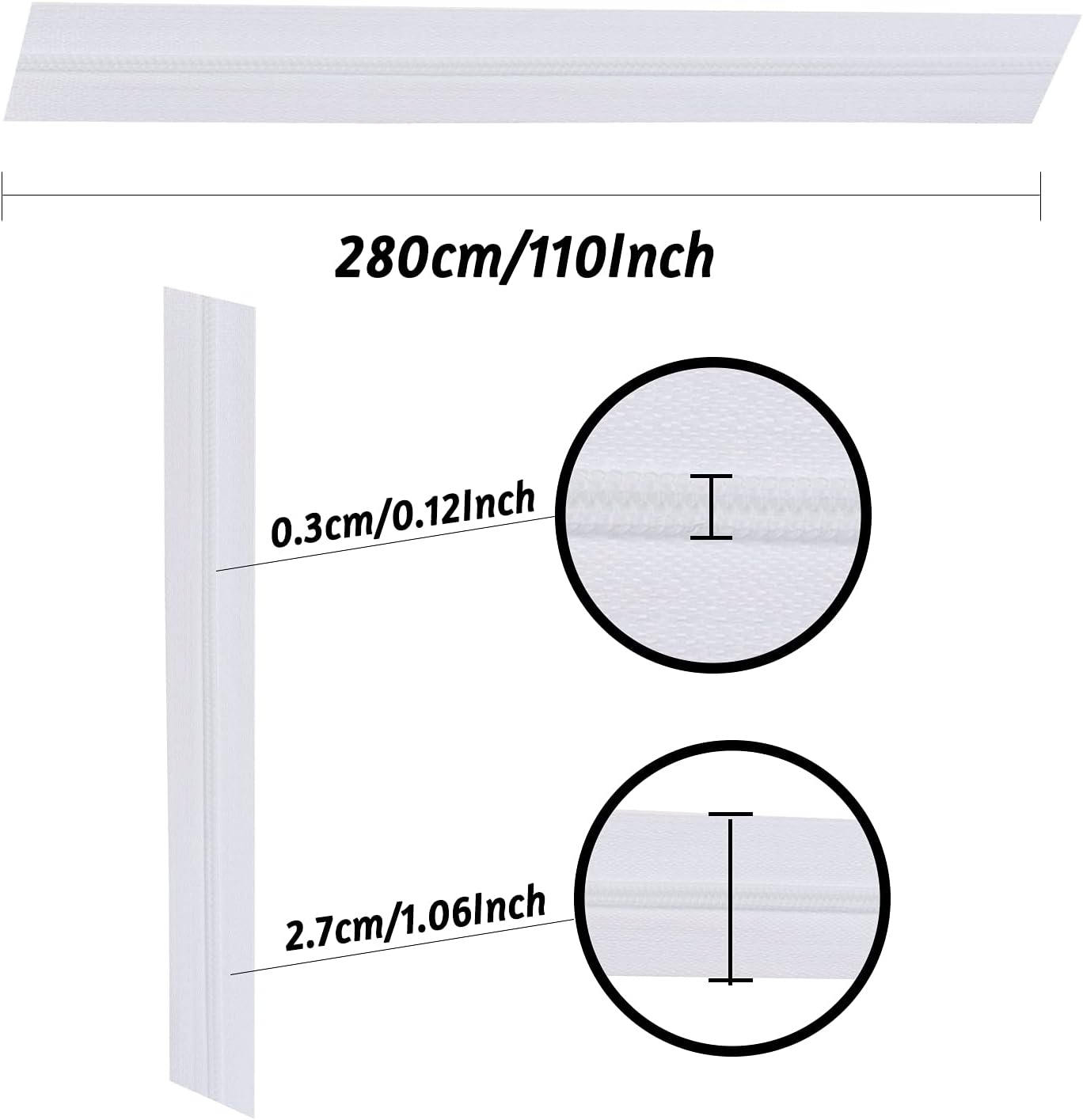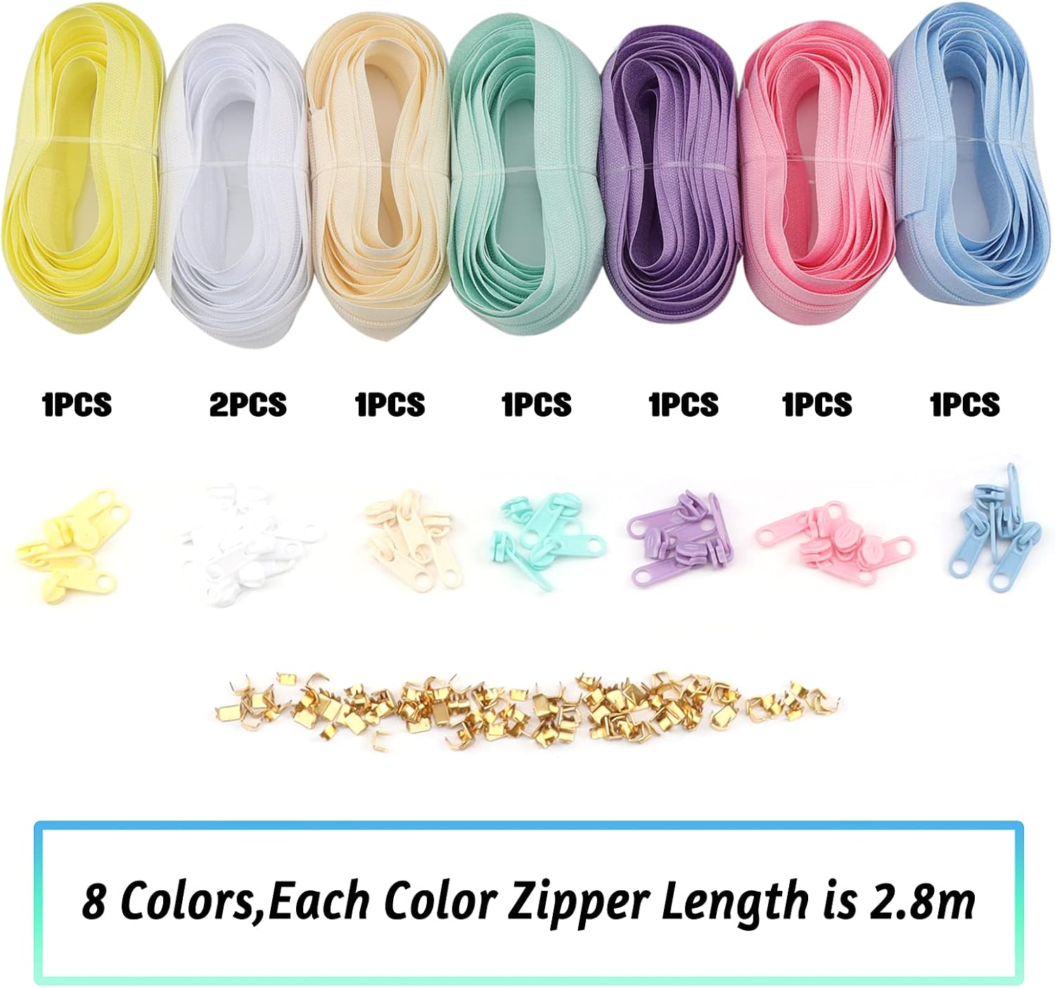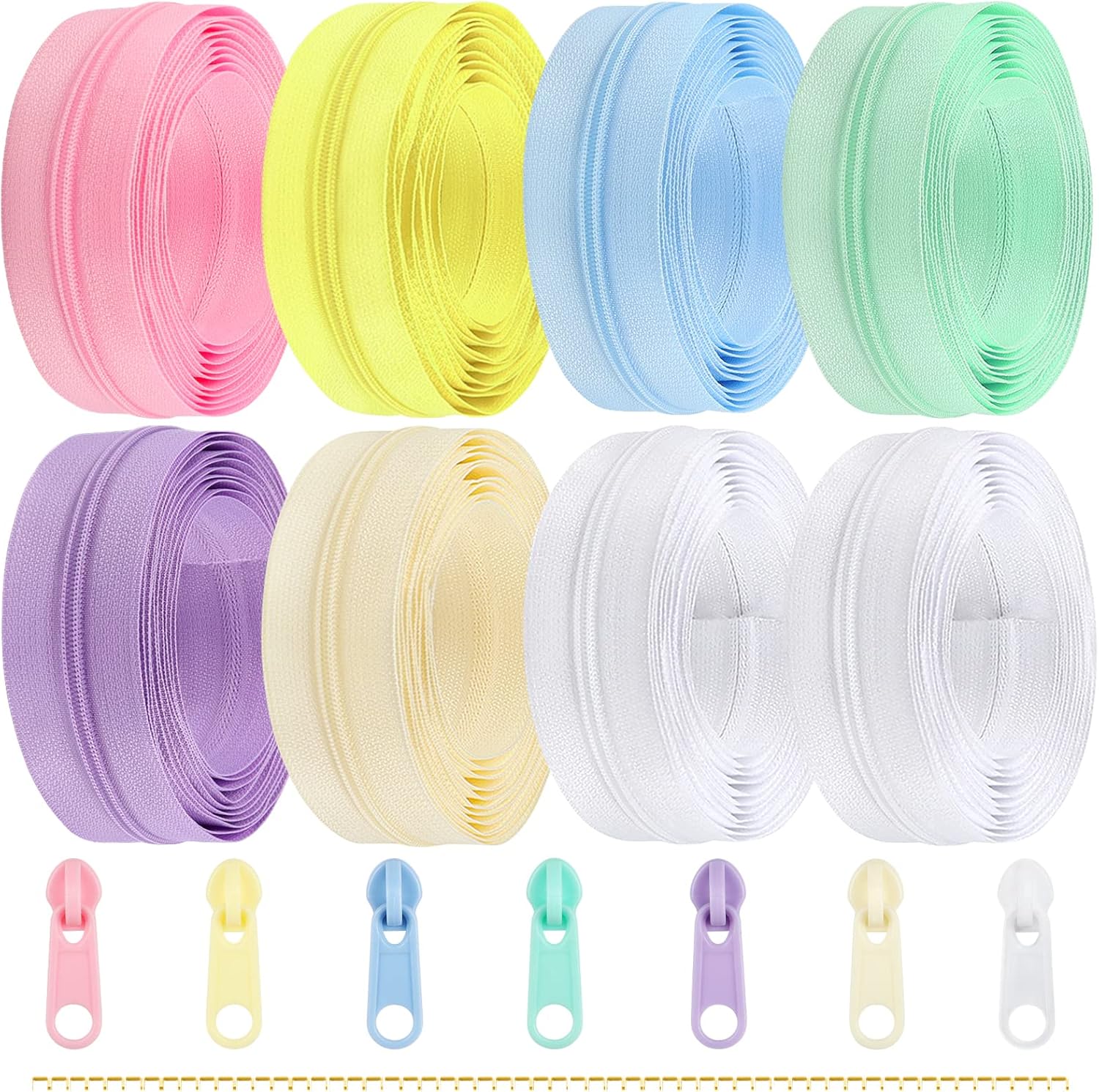 - Zippers by The Yard for Sewing 22.4 metre zip in 7 different colours (1 x mint green, 1 x light yellow, 1 x light pink, 2 x white, 1 x light purple, 1 x milky white, 1 x light blue) each with 2.8 m length. as shown in the picture.