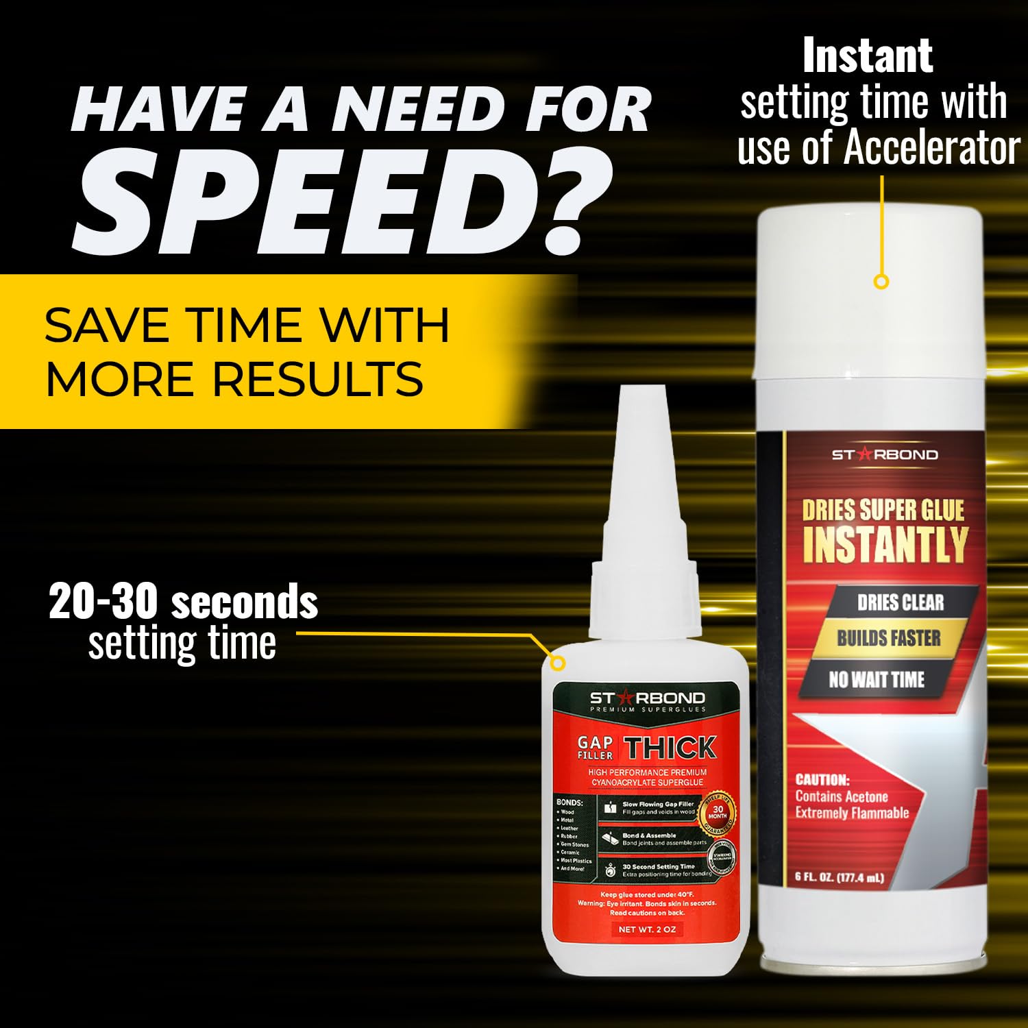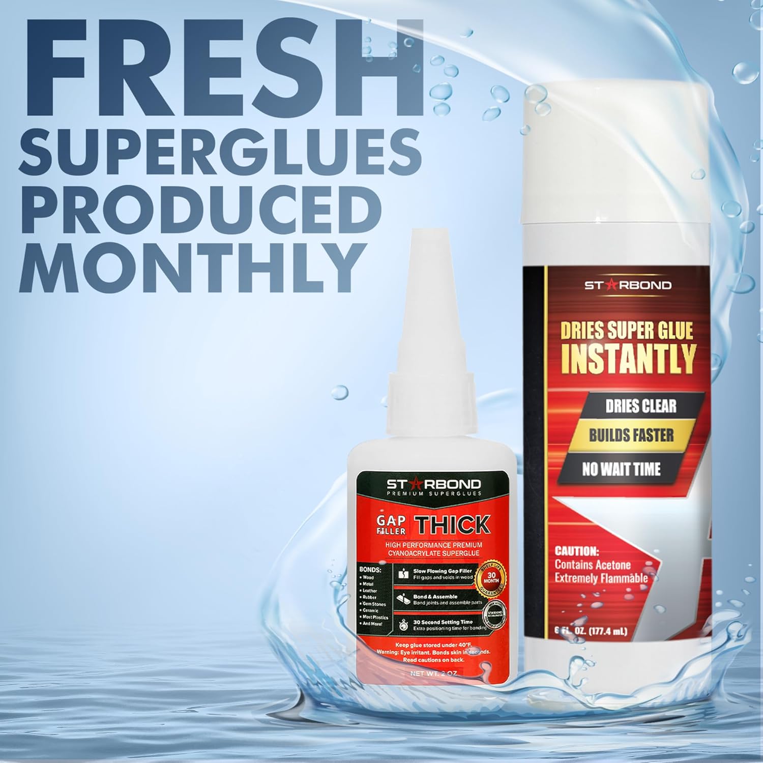 Starbond 2 oz Thick CA Glue with 6 oz Aerosol Activator Bundle Premium Cyanoacrylate Super Glue for Mitre Joint Bonding, Woodworking, Carpentry, Archery Fletching