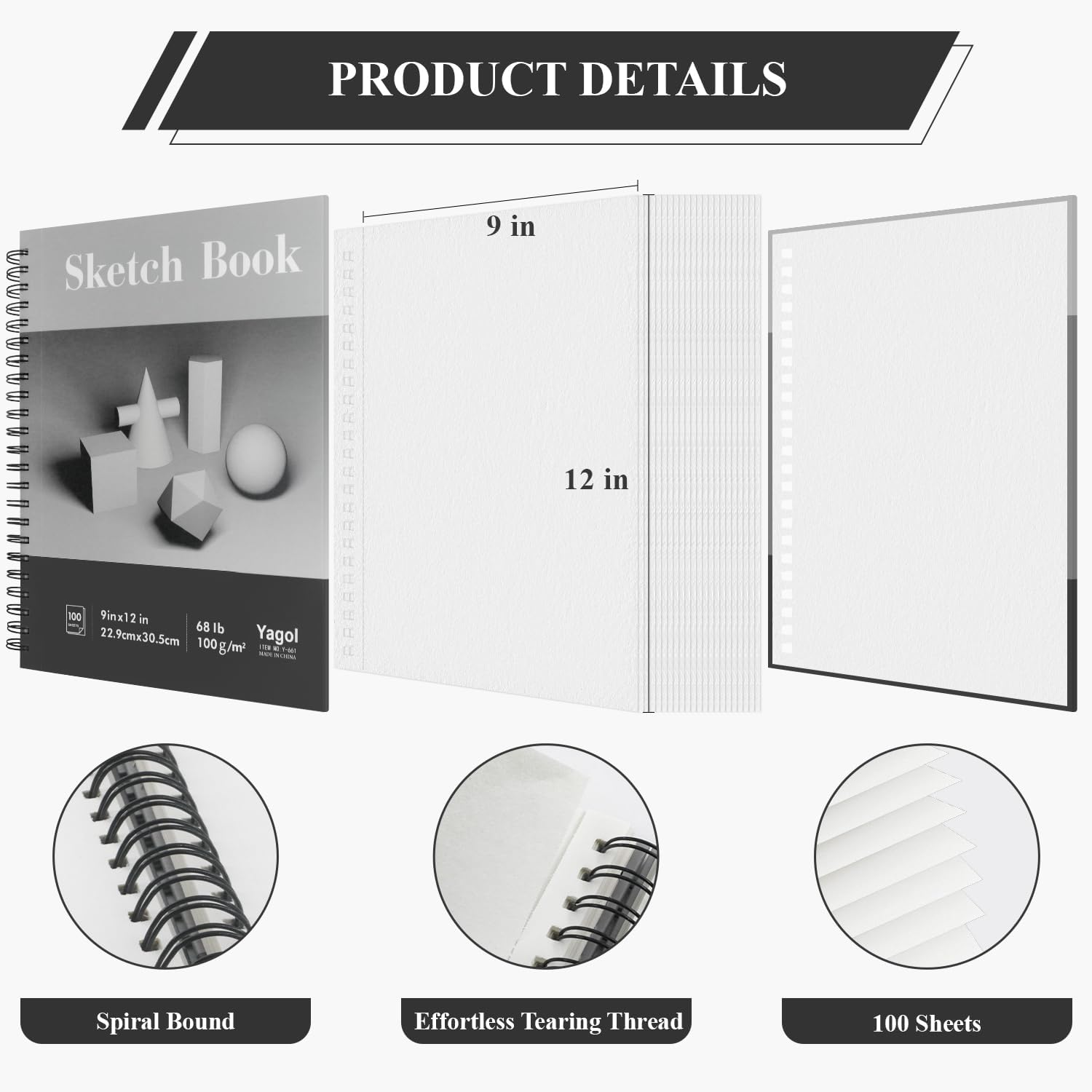 Yagol Sketch Book 9x12 Inch 100 Sheets 68LB/100GSM, Sketch Pad with Spiral-Bound Art Paper for Drawing and Painting for Pencils, Charcoal, Dry Media